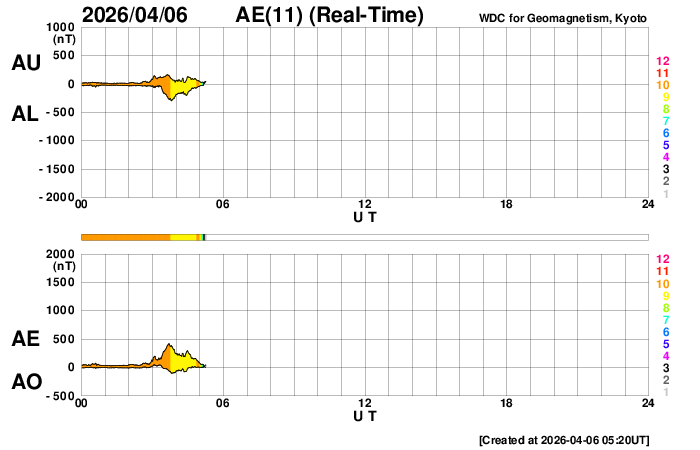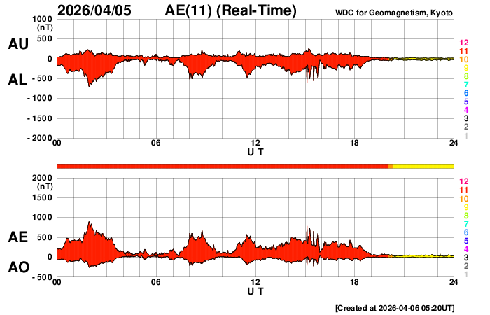 2026/ 4/ 6 14:31 更新 太陽風は高速の状態が続いています。太陽は穏やかになっています。 担当 篠原 MAPS彗星の太陽接近後に、 太陽の右上に広がって行った彗星の尾と思われる部分は、 更に右上に飛んで行っています。 SOHO衛星LASCO C2とC3の動画を掲載します。 C3では、写真を1時間毎に間引いて、 彗星の見え始めからの動画にしています。 彗星が残らなかったのは残念でした。 太陽風は、530km/秒と高速の状態が続いています。 磁場強度は、4nTと平均的な状態です。 SDO衛星AIA193の太陽コロナ写真では、 西の端(右端)に達したコロナホールはほとんど見えなくなっていますが、 この領域の影響が続いているのでしょうか。 太陽風磁場の南北成分は、 南寄りから北寄りに傾向が変わっています。 AE指数もこの影響で、 グラフの途中までは500nT程度の変化が続いていますが、 その後は変化が少なくなって穏やかになっています。 太陽の南東側(左下)や北東側(左上)に小さいコロナホールが見えています。 27日前の前周期は、全体が大きく繋がる広がりになっていて、 太陽風の速度も700km/秒まで高まっていたのですが、 今回はどうなるでしょうか。 太陽は、X線グラフの変化が急に少なくなり、 穏やかになっています。 北西側(右上)の4409黒点群の活動は、 C2.8の小規模フレアが最大です。