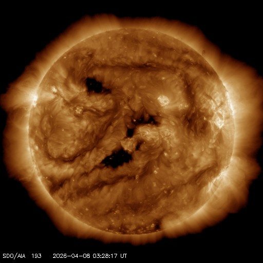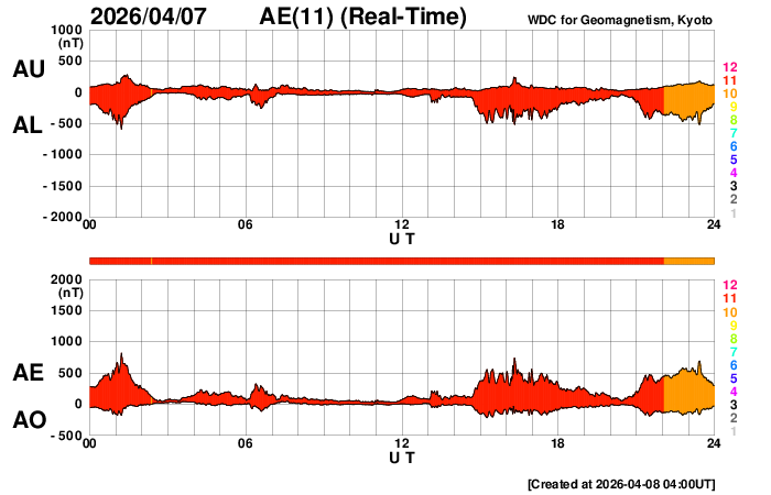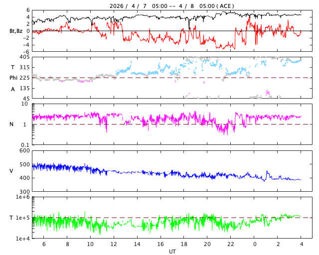 2026/ 4/ 8 13:13 更新 太陽風の速度は平均的な速さに下がっています。磁気圏は穏やかです。 担当 篠原 太陽風の速度は、500km/秒から390km/秒へ下がり、 平均的な速度に戻って、このまま低速になりそうな様子です。 磁場強度は、5nTと平均的な値です。 磁場の南北成分は、グラフの中盤で南向きに強まっています。 この頃に、磁気圏の活動もある程度強まって、 AE指数は、500nTを少し超えるくらいの中規模の変化が 半日ほど続いています。 その後は、磁場は0nT付近で変化する様になり、 現在の磁気圏は穏やかです。 SDO衛星AIA193では、太陽の中心部にコロナホールが見えています。 広がりは前周期よりも小さくなっていますが、 どの程度の影響がやって来るでしょうか。 27日周期の図を見ると、 前周期は、明日に相当する3月13日から太陽風の速度が高まっています。 太陽は、西の端(右端)に近づいた4409黒点群でC5.7の小規模フレア、 北東の端(左上)に現れた4414群でC2.4の小規模フレアが発生しています。 4414群はどの程度の活動度でしょうか。