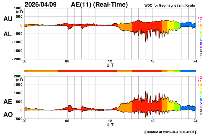 2026/ 4/10 09:48 更新 太陽風は低速ですが、磁場が南向きに変化して磁気圏の活動が強まりました。 担当 篠原 太陽風は、360〜380km/秒と低速の状態で推移していますが、 グラフの中程で小幅ですが 速度が400km/秒に急に高まる変化が発生しています。 太陽風の弱い乱れが到来した様で、 磁場強度を見ると、初めは5nTと平均的な状態でしたが、 速度が高まった頃から上昇が始まり、 グラフの後半は9nTとやや強まった状態に変わっています。 南北成分も、グラフの前半は0nT付近でしたが、 速度が高まった所から急に南向きに変化して、 -5nT程度の南向きがしばらく続いています。 この影響で磁気圏の活動が強まり、 AE指数は、前半は変化がありませんでしたが、 途中から500〜1000nTと中規模の活動が半日近く発生しています。 現在は磁場の南北成分は0nT付近に戻っていて、 磁気圏の活動も小さくなっています。 SDO衛星AIA193の太陽コロナ写真では、 小ぶりのコロナホールが 中心部の南西側(右下)や北側(上側)に見えています。 この領域の影響がこれから始まりそうです。 27日周期の図を見ると、 前周期の速度の高まりは3月13日に始まっていますが、 今回はこれよりも遅れています。 どの様な変化がやって来るのか注目して下さい。 太陽は、昨夕、9日17時半(世界時9日8時半)に、 西の端(右端)の4409黒点群でM1.0の中規模フレアが発生しました。 この領域が見えなくなると、X線強度は次第に下がり、 変化も見られなくなって、太陽はとても穏やかになっています。 可視光写真では、はっきり見える黒点は、 東側(左側)の4414群と4415群だけになっています。 ![]() SDO衛星のAIA193カメラによる太陽コロナの様子 (c) SDO (NASA) ![]() SDO衛星による太陽の可視光写真。マウスの矢印を写真に重ねると、黒点番号付きの写真に切り替わります。 (c) SDO (NASA) ![]() ACEが観測した太陽風の磁場(黒線は全体の強度、赤線は南北成分) 磁場の向き、プラズマの密度、速度、温度 (c) データ:NOAA/SWPC、作図:宇宙天気ニュース ![]() AE指数(速報値) 下段のAEグラフの値が高くなると、オーロラ活動が活発化しています。 (c) 京都大学WDC ![]() ![]() 27日の太陽周期に合わせた図 太陽が同じ面を地球に向けていた27日前の変化から、今後を予想することができます。 (c) 作図:宇宙天気ニュース