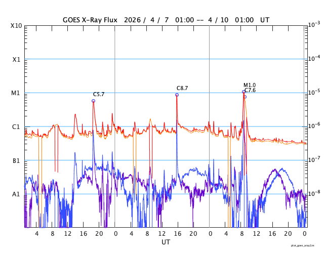 GOES衛星の太陽X線強度。赤・橙 = 0.1〜0.8 nm、青・紫 = 0.05〜0.4 nm (c) データ:NOAA/SWPC、作図:宇宙天気ニュース ![]() | ||||||||||||||||||||||||||||||||||||||||||||||||||||||||||||||||||||||||||||||||||||||||||||||||||||||||||||||||||||||||||||||||||||||||||||||||||||||||||||||||||||||||||||||||||||||||||||||||||||||||||||||||||||||||||||||||||||||||||||||