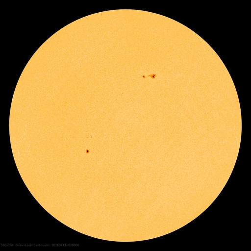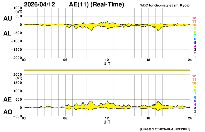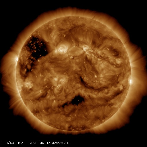 2026/ 4/13 12:33 更新 太陽風は平均的な速度に戻っています。太陽は穏やかな状態です。 担当 篠原 11日から12日にかけて、 小型の彗星が太陽に接近する様子が SOHO衛星LASCO C2、C3で見えていました。 9日のニュースで紹介した彗星の動画とそっくりの見え方です。 太陽風の速度は、550km/秒から450km/秒へゆっくりと低下して、 高速の状態は終わっています。 磁場強度は、5nTと平均的な値が続いています。 コロナホールの影響は、一旦終わった様です。 SDO衛星AIA193を見ると、 太陽の中心部の南側(下側)に小さいコロナホールが見えています。 明後日くらいに、この領域の影響で速度がやや高まるかもしれません。 一方、北東の端(左上)には、コロナホールの大きい広がりが見えています。 5日後くらいから、この領域の影響で太陽風は高速になりそうです。 27日周期の図では、 前周期の3月22日からの速度の高まりの回帰に相当します。 太陽風磁場の南北成分は、弱い南向きの変化が時々発生しています。 磁気圏では小規模の活動が発生していて、 AE指数は、300nT程度の変化が度々発生しています。 速度が下がって来たので、 この後の活動は規模が小さくなりそうです。 太陽は、昨日のニュースの後も西の端(右端)の領域で C1〜2の小規模フレアが発生しましたが、 その後は活動がなくなり、穏やかになっています。