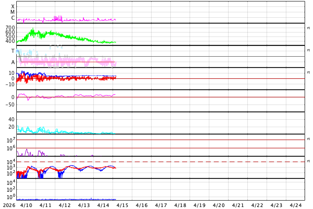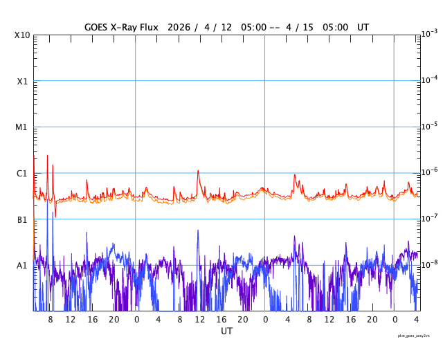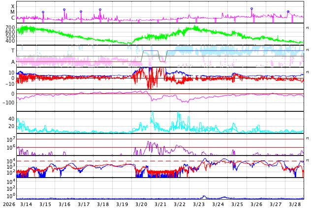 GOES衛星の太陽X線強度。赤・橙 = 0.1〜0.8 nm、青・紫 = 0.05〜0.4 nm (c) データ:NOAA/SWPC、作図:宇宙天気ニュース ![]() | ||||||||||||||||||||||||||||||||||||||||||||||||||||||||||||||||||||||||||||||||||||||||||||||||||||||||||||||||||||||||||||||||||||||||||||||||||||||||||||||||||||||||||||||||||||||||||||||||||||||||||||||||||||||||