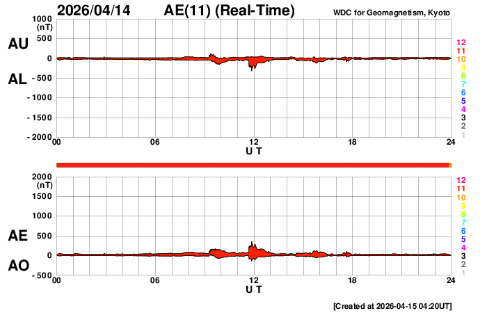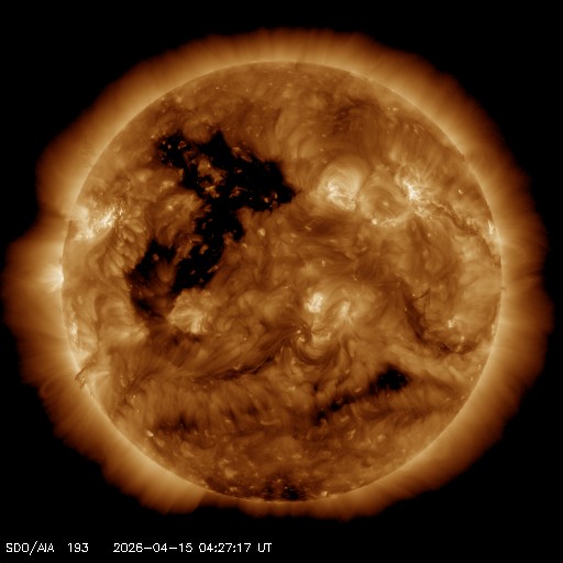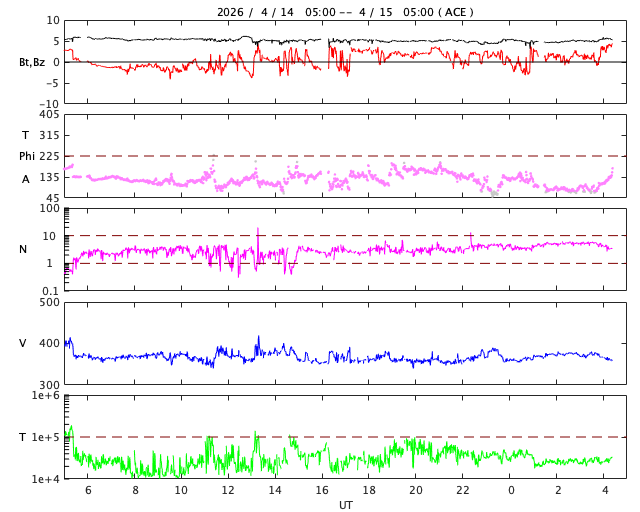 2026/ 4/15 13:37 更新 太陽風は低速になり、磁気圏は穏やかな状態です。太陽も穏やかです。 担当 篠原 太陽風は、370km/秒と低速の状態で安定しています。 磁場強度は、5nTと平均的な値が続いています。 磁場の南北成分は、弱い北寄りになっています。 速度が下がっていることもあり、磁気圏はとても穏やかで、 AE指数はほとんど変化のない状態です。 SDO衛星AIA193を見ると、 北東側(左上)に大きく広がるコロナホールが見えています。 先頭(右端)が太陽の中心線に達していて、 3日後くらいから太陽風の速度が高まりそうです。 27日周期の図を見ると、 前周期の太陽風は650km/秒くらいに速度が高まっています。 コロナホールの広がりは、 現在の方が大きくなっている様に感じます。 太陽風速度の高まりはどうなるでしょうか。 太陽は穏やかな状態が続いています。 X線グラフはCクラスに達する変化も発生していません。 ![]() SDO衛星のAIA193カメラによる太陽コロナの様子 (c) SDO (NASA) ![]() SDO衛星による太陽の可視光写真。マウスの矢印を写真に重ねると、黒点番号付きの写真に切り替わります。 (c) SDO (NASA) ![]() ACEが観測した太陽風の磁場(黒線は全体の強度、赤線は南北成分) 磁場の向き、プラズマの密度、速度、温度 (c) データ:NOAA/SWPC、作図:宇宙天気ニュース ![]() AE指数(速報値) 下段のAEグラフの値が高くなると、オーロラ活動が活発化しています。 (c) 京都大学WDC ![]() ![]() 27日の太陽周期に合わせた図 太陽が同じ面を地球に向けていた27日前の変化から、今後を予想することができます。 (c) 作図:宇宙天気ニュース