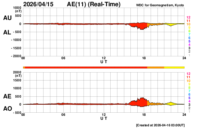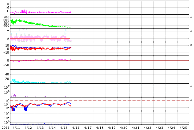 2026/ 4/16 12:02 更新 太陽風はより低速になっています。磁気圏は穏やかです。 担当 篠原 太陽風の速度は、370km/秒から340km/秒へ下がり、 より低速になっています。 磁場強度は、5nT前後と平均的な状態です。 磁場の南北成分はグラフの中央で南向きに変化していますが、 その他は北寄りです。 太陽風の速度が下がっていることもあり、磁気圏は基本的に静穏で、 AE指数は、磁場が南向きになった頃に 400nTの小規模の変化が起きていますが、 その他はほとんど変化のない状態です。 SDO衛星AIA193では、 北半球のコロナホールが西側(右側)に少し進んでいます。 明後日くらいから太陽風の速度が高まる可能性があります。 太陽のX線グラフは、変化の少ない状態が続いています。 グラフの最後にC1.2の小規模フレアが発生した程度です。 一方、SOHO衛星LASCO C2、C3を見ると、 太陽の左下に広がるCME(コロナ質量放出)や、 右側に広がる淡いCMEが発生しています。 太陽を地球よりも右側から観測している STEREO Ahead衛星COR2と比較すると、 左下のCMEは太陽のこちら側、 右上のCMEは太陽の向こう側で発生している様です。 こちら側のCMEについてですが、 SDO衛星では目立つほどの変化はなく、 SDO衛星AIA193で、 15日19時(世界時15日10時)頃に太陽の南側(下側)で コロナのガスが変化する様子が見えています。 これがCMEに関係しているのかもしれません。 この場合、太陽風の弱い乱れが地球に到来する可能性があります。 コロナホールの高速風もやって来るので、 変化としては分かりにくいかもしれません。