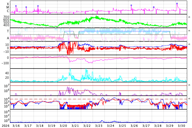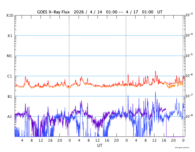 GOES衛星の太陽X線強度。赤・橙 = 0.1〜0.8 nm、青・紫 = 0.05〜0.4 nm (c) データ:NOAA/SWPC、作図:宇宙天気ニュース ![]() | ||||||||||||||||||||||||||||||||||||||||||||||||||||||||||||||||||||||||||||||||||||||||||||||||||||||||||||||||||||||||||||||||||||||||||||||||||||||||||||||||||||||||||||||||||||||||||||||||||||||||||||||||||||||