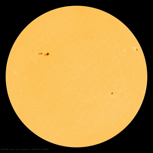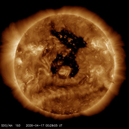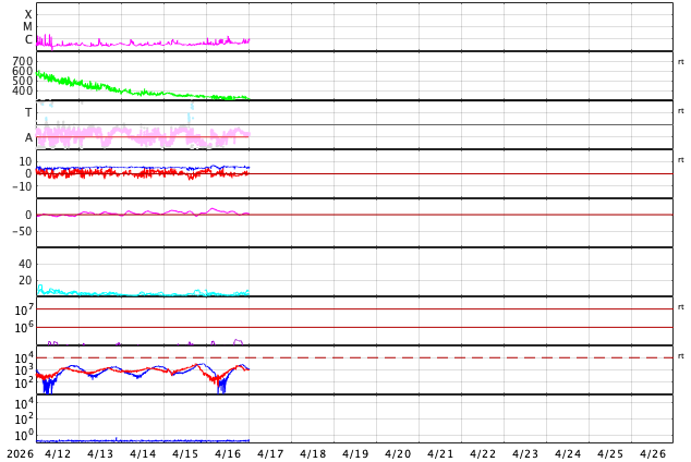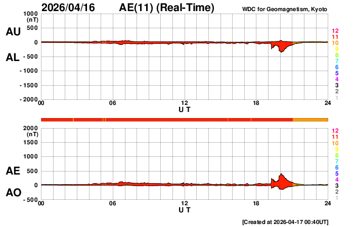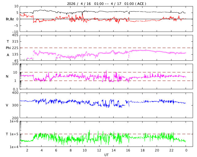 2026/ 4/17 09:43 更新 太陽風は低速の状態が続いています。明日くらいから太陽風の速度が高まりそうです。 担当 篠原 太陽風の速度は、330km/秒と低速の状態が続いています。 グラフの最後は310km/秒へ下がっていて、 この後、より低速になるかもしれません。 磁場強度は、5nTと平均的な状態です。 磁気圏は穏やかな状態です。 AE指数は、400nTの小規模の変化が1回起きただけで、 その他はほとんど変化がありません。 SDO衛星AIA193の太陽コロナ写真を見ると、 中心部から北側(上側)にかけてコロナホールが大きく広がっています。 明日くらいから高速の太陽風が到来しそうです。 コロナホールの東西(横方向)の広がりから考えると、 速度の高まりは、5日くらい続きそうです。 太陽は穏やかな状態です。 中心部北東側(左上)の4419黒点群では、 C1台の小規模フレアを含めた小さい活動が続いています。 この後も続くでしょうか。