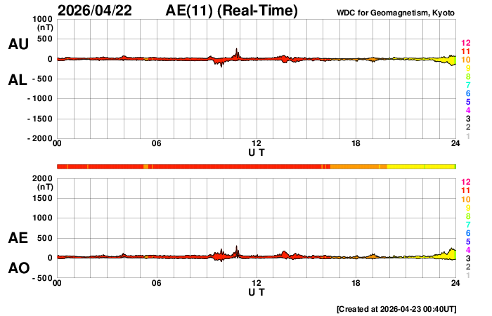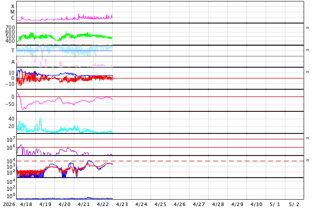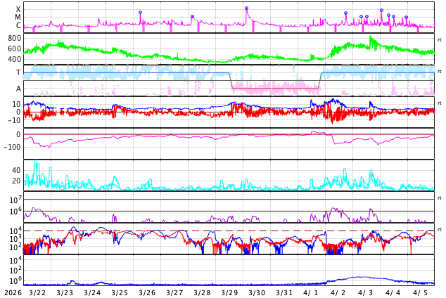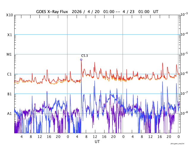 GOES衛星の太陽X線強度。赤・橙 = 0.1〜0.8 nm、青・紫 = 0.05〜0.4 nm (c) データ:NOAA/SWPC、作図:宇宙天気ニュース ![]() | ||||||||||||||||||||||||||||||||||||||||||||||||||||||||||||||||||||||||||||||||||||||||||||||||||||||||||||||||||||||||||||||||||||||||||||||||||||||||||||||||||||||||||||||||||||||||||||||||||||||||||||||||||||||||||||||||||||||||||||||||||