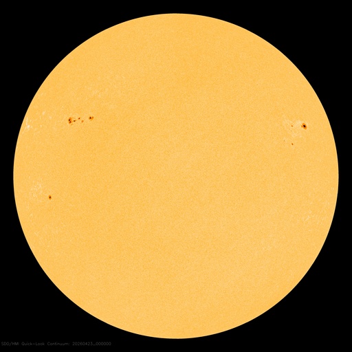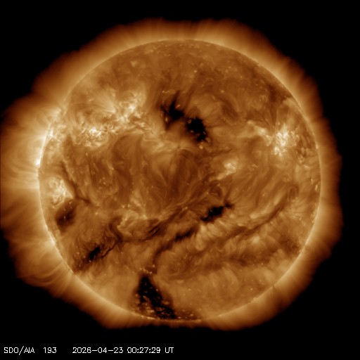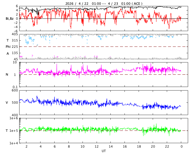 2026/ 4/23 09:48 更新 太陽風は平均的な速度に戻っています。Cクラスのフレアが続いています。 担当 篠原 太陽風の速度は、昨夜までは500km/秒と高速の状態が続きましたが、 その後ゆっくり低下して、 現在は460km/秒と平均的な速さに戻っています。 磁場強度は、5nTと平均的な状態が続いています。 磁場の南北成分は、グラフの中盤までは北寄りで、 後半は0nT付近で小さく変化する様になっています。 磁気圏は静穏で、AE指数は小さい変化が時々見られる程度です。 SDO衛星AIA193では、太陽の中心線の北側に小さいコロナホールが、 南側に細長いコロナホールが見えています。 2〜3日後に弱い影響がやって来るかもしれません。 27日周期の図を見ると、 前周期は、3日後に相当する3月30日に 速度の弱い高まりが発生しています。 今回はどうでしょうか。 太陽は、北東(左上)の4420黒点群の活動が続いていて、 Cクラスの小規模フレアの発生が続いています。 今日未明からは、C3.7、C2.3、C3.0と規模が少し大きくなっています。 可視光写真を見ると、4420群の黒点が少し大きくなっています。 この後はどうなるでしょうか。