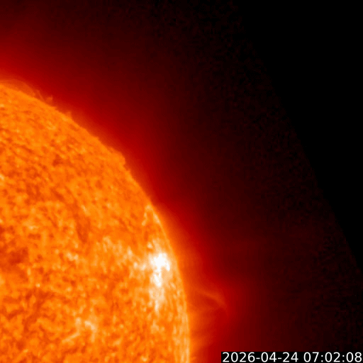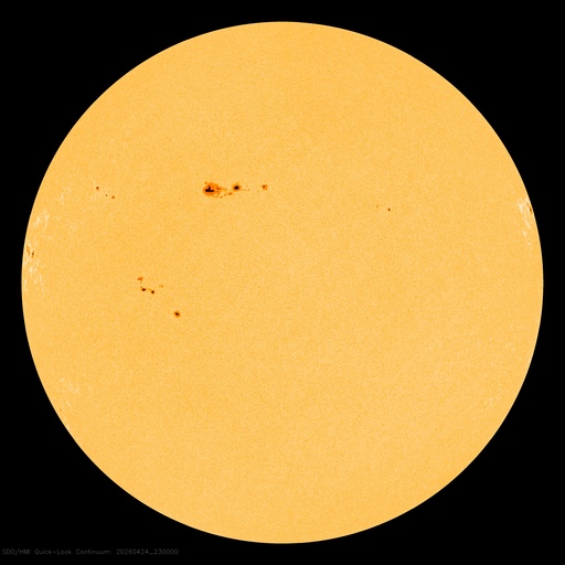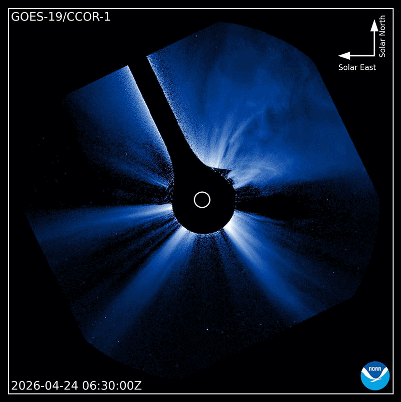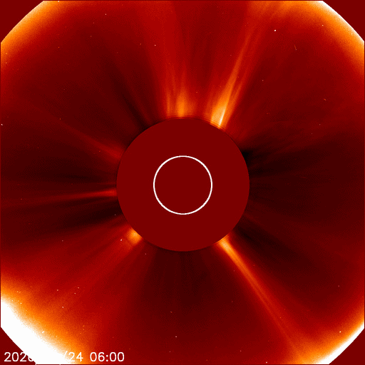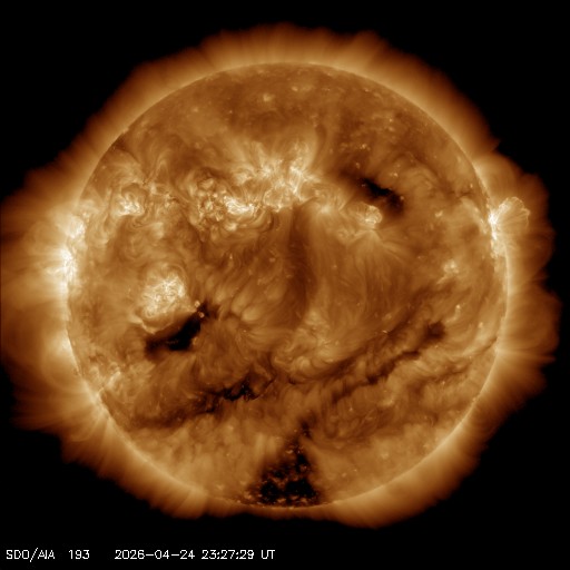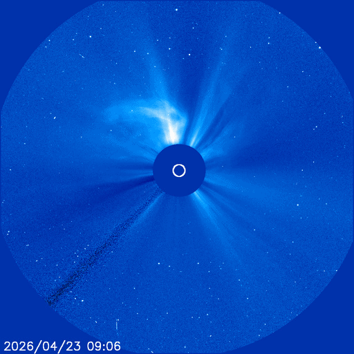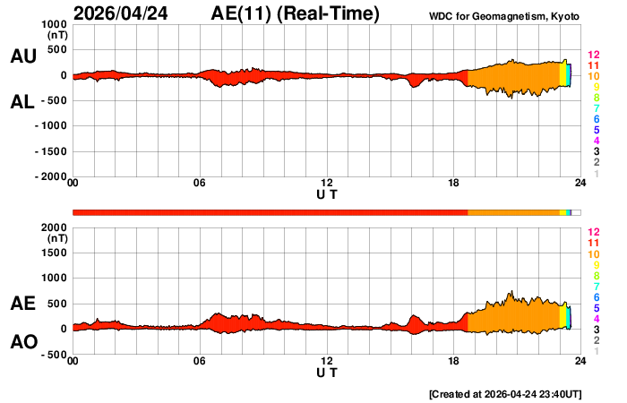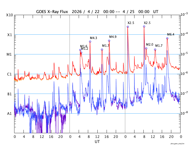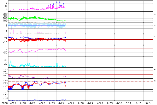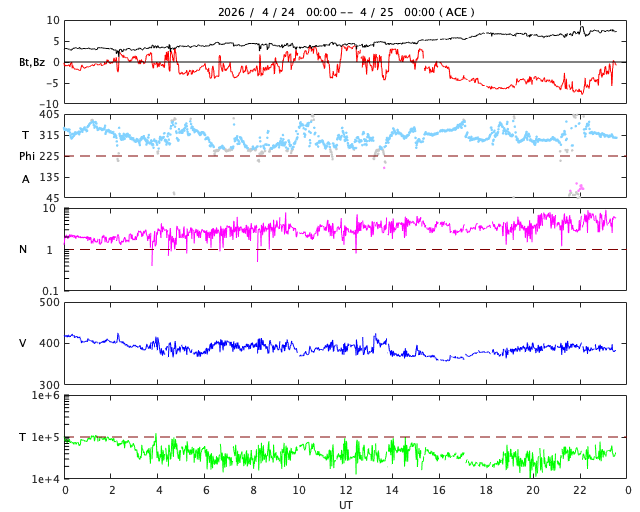 2026/ 4/25 08:43 更新 X2.5の大規模フレアが発生しました。パンスターズ彗星がコロナグラフで見えています。 担当 篠原 昨日、SOHO衛星LASCO C3の右端に見え始めていた パンスターズ(PANSTARRS)彗星は、 更に太陽に近付いて見えています。 GOES衛星CCOR-1、SOHO衛星LASCO C3の動画を掲載します。 また、太陽を地球よりも右斜めから観測している STEREO Ahead衛星のHI2でも、17日から彗星が見えていました。 現在までの動画を掲載します。 尾の形の変化がとても印象的です。 太陽は、北西の端(右上)に達した4419黒点群の活動が続いています。 昨夕、24日17時(世界時24日8時)にX2.5の大規模フレア、 25日3時(世界時24日18時)にM6.4の中規模フレアが発生しています。 X2.5の大規模フレアの様子をGOES衛星SUVI 131の動画で紹介します。 また、昨日のX2.4と同じ様に(NOAA/SWPCの発表値は2.4でした)、 GOES衛星SUVI 304でコロナが噴出する様子が観測されています。 SOHO衛星LASCO C2、C3では、 CME(コロナ質量放出)が太陽の右上に飛び出しています。 横向きに近いので地球への影響はなさそうです。 4419群は、この後太陽の向こう側へ進みます。 活動が見えるのはもうしばらくです。 また、太陽中心部南東側(左下)の4423黒点群でも 昨日の午後からフレアが続く様になり、 C7.9、M1.9、M1.7、C7.0などの、中規模、小規模フレアが発生しています。 今後の活動に注目して下さい。 太陽風は、速度が380km/秒へ下がり、やや低速になっています。 磁場強度は、3nTから7nTへゆっくり上がっています。 磁場の南北成分は、 グラフの後半で、-5nTと南向きに少し強まっています。 このため、磁気圏の活動がやや強まって、 AE指数は600nT程度の中規模の変化が発生しています。 ![]() 太陽に接近するパンスターズ(PANSTARRS)彗星。 (c) GOES衛星CCOR-1 (NOAA)、(動画加工 : 宇宙天気ニュース) ![]() 太陽に接近するパンスターズ(PANSTARRS)彗星。 (c) SOHO衛星LASCO C3 (ESA & NASA)、(動画加工 : 宇宙天気ニュース) ![]() 太陽を地球よりも右斜めから観測しているSTEREO Ahead衛星によるパンスターズ(PANSTARRS)彗星。 (c) STEREO Ahead衛星HI2 (NASA)、(動画加工 : 宇宙天気ニュース) ![]() 4419群で発生したX2.5の大規模フレア。 (c) GOES衛星SUVI 131 (NOAA)、(動画加工 : 宇宙天気ニュース) ![]() X2.5大規模フレアの時に発生したコロナの噴き上がりの様子。 (c) GOES衛星SUVI 304 (NOAA)、(動画加工 : 宇宙天気ニュース) ![]() CMEが太陽の右上に広がっています。 (c) SOHO衛星LASCO C2、C3 (ESA & NASA)、(動画加工 : 宇宙天気ニュース) ![]() SDO衛星のAIA193カメラによる太陽コロナの様子 (c) SDO (NASA) ![]() SDO衛星による太陽の可視光写真。マウスの矢印を写真に重ねると、黒点番号付きの写真に切り替わります。 (c) SDO (NASA) ![]() GOES衛星の太陽X線強度。赤・橙 = 0.1〜0.8 nm、青・紫 = 0.05〜0.4 nm (c) データ:NOAA/SWPC、作図:宇宙天気ニュース ![]() ACEが観測した太陽風の磁場(黒線は全体の強度、赤線は南北成分) 磁場の向き、プラズマの密度、速度、温度 (c) データ:NOAA/SWPC、作図:宇宙天気ニュース ![]() AE指数(速報値) 下段のAEグラフの値が高くなると、オーロラ活動が活発化しています。 (c) 京都大学WDC ![]() 27日の太陽周期に合わせた図 太陽が同じ面を地球に向けていた27日前の変化から、今後を予想することができます。 (c) 作図:宇宙天気ニュース