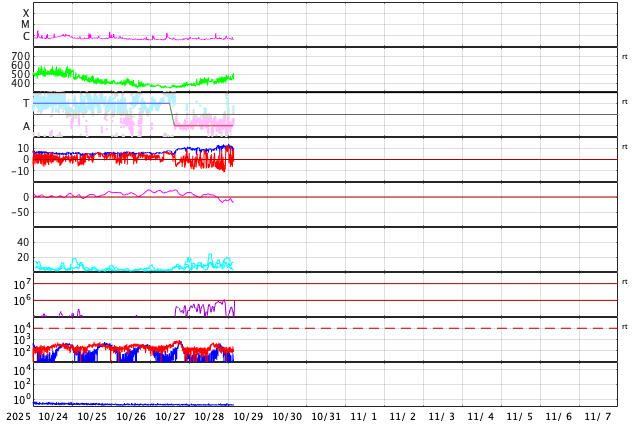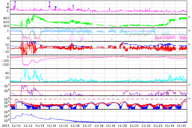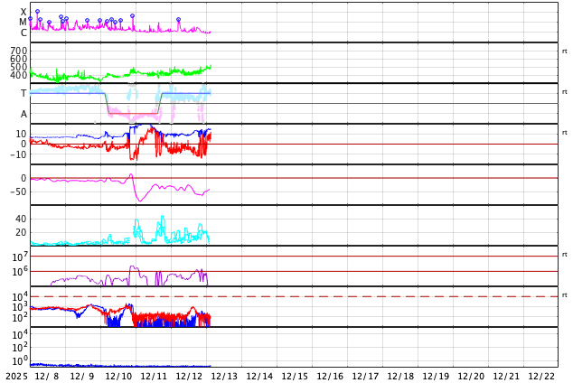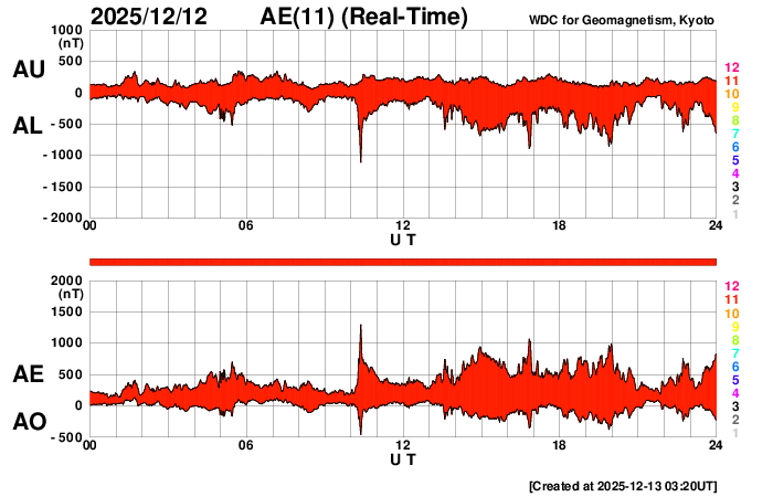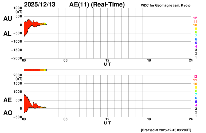 下段のAEグラフの値が高くなると、オーロラ活動が活発化しています。