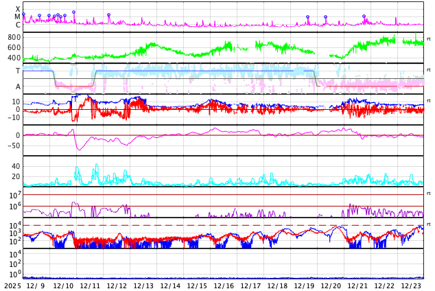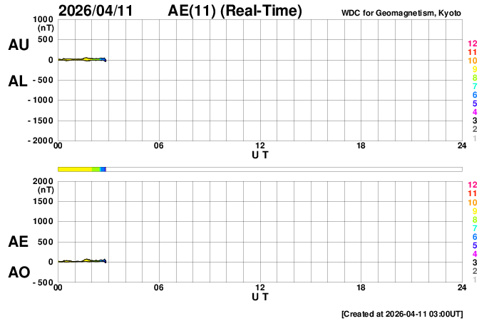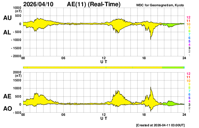 下段のAEグラフの値が高くなると、オーロラ活動が活発化しています。