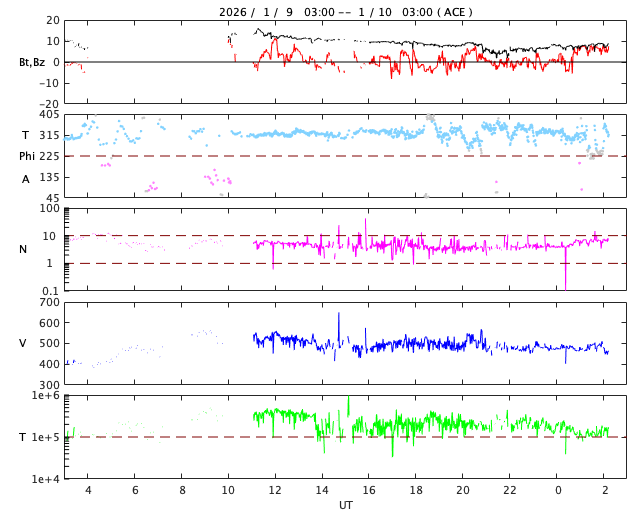 - 2026/ 1/ 8 12:55 太陽風は低速ですが、磁場が南向きに変化して磁気圏の活動が少し強まっています。