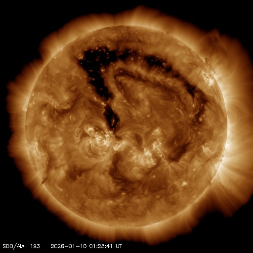 コロナホールは太陽の北東側(左上)にかけて広がっていて、