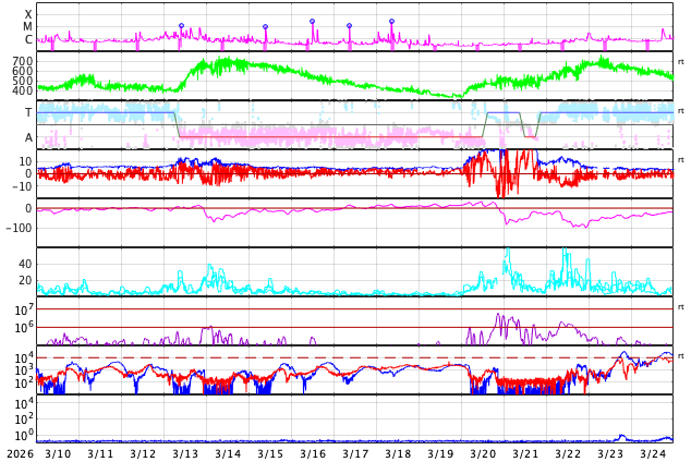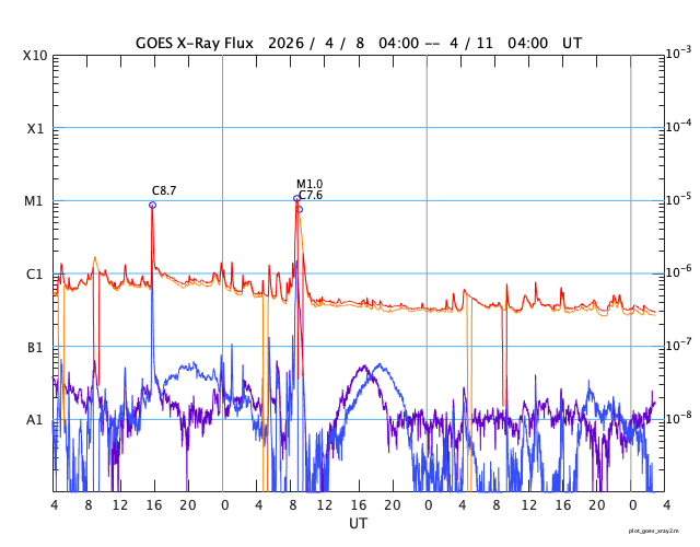 GOES衛星の太陽X線強度。赤・橙 = 0.1〜0.8 nm、青・紫 = 0.05〜0.4 nm