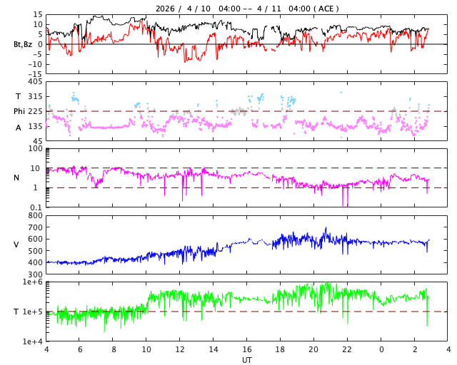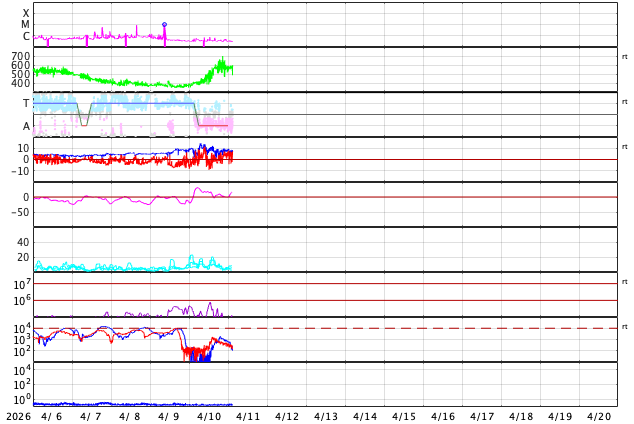 - 2026/ 4/10 09:48 太陽風は低速ですが、磁場が南向きに変化して磁気圏の活動が強まりました。