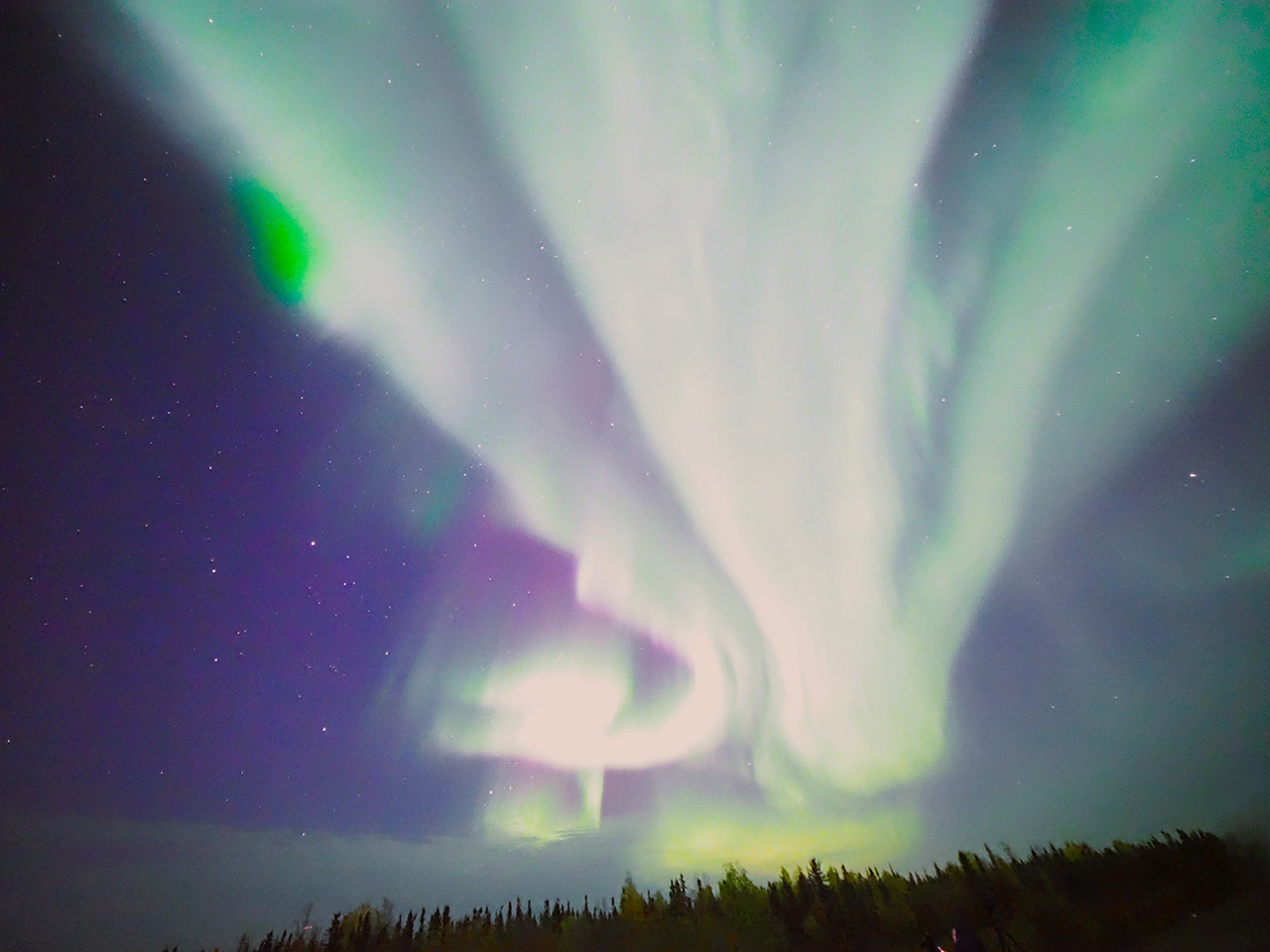 2025/ 9/19 13:28 更新 太陽風は平均的な速度に戻っています。イエローナイフのオーロラをどうぞ。 担当 篠原 カナダ・イエローナイフに滞在中の 景山植光さんよりお送りいただいたオーロラ写真の続きを紹介します。 1、2枚目は昨日の写真の数分後の撮影で、 昨日のオーロラをそのまま東の地平線へ追いかけて行って撮影した様です。 昨日から続くオーロラの複雑な動きが印象的です。 3枚目は30分ほど後の撮影です。 高い空から降り注ぐような赤いオーロラの帯がとてもきれいです。 昨日のAE指数のグラフを見ると、 400nTくらいの変化が3時間程続いています。 素晴らしい夜だっただろうと思います。 とてもきれいな写真をどうもありがとうございます。 太陽風は、昨日のニュースの後も速度の低下が続き、 今日未明には500km/秒台を割り、 現在は430km/秒と平均的な速度に戻っています。 磁場強度は3nTとやや弱い状態です。 27日周期の図を見ると、今回の高速太陽風は4日ほど続きました。 27日前の前周期の変化と比較すると、 到来が半日ほど早まって、継続時間は同じくらいになっています。 次の回帰はどうなるでしょうか。 太陽風磁場の南北成分は、 グラフの前半は南向きに変化していて、 AE指数では500nTの中規模の変化が発生しています。 その後は北寄りに変わり、磁気圏は穏やかになっています。 GOES衛星SUVI 195では、 北半球のコロナホールが太陽の中心線に達しています。 3日後の22日くらいから太陽風の速度が高まる可能性があります。 太陽は穏やかな状態が続いています。 南西(右下)の4220黒点群でC3.6、 南東(左下)の4223群でC2.9の小規模フレアが発生した程度です。