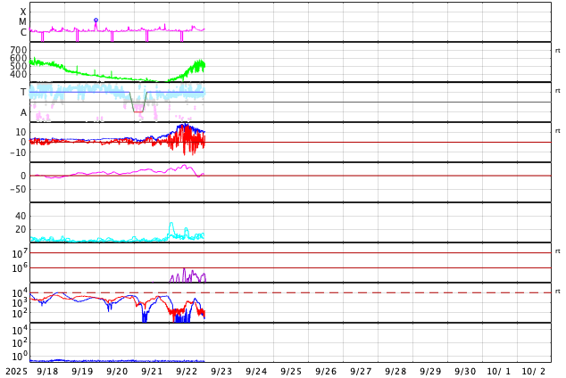 2025/ 9/23 10:02 更新 高速太陽風が到来して、速度は520km/秒に高まっています。 担当 篠原 太陽風は、330km/秒と低速の状態からゆっくりと高まり、 23日3時(世界時22日18時)頃に520km/秒と高速の風になり、 以降、この状態が続いています。 コロナホールの影響が始まった様です。 太陽風の磁場強度は、10nTから18nTへ強まり、 その後下がって、現在は10nTに戻っています。 強まった状態は続いています。 太陽風磁場の南北成分は、北寄りになっています。 このため、磁気圏の活動はあまり強まっておらず、 AE指数は、速度が高まった後に時々500nTの変化が発生する程度です。 GOES衛星SUVI 195では、 コロナホールは北西側(右上)に更に進んでいます。 横の広がりがあまり大きくないので、 高速太陽風は比較的短い期間で終わりそうです。 どのくらい続くか注目して下さい。 昨日のニュースで紹介した、 太陽の右下へ広がるCME(コロナ質量放出)の続きの動画を掲載します。 C2(赤色)に続いて、C3(青色)でもきれいに広がっています。 太陽の可視光写真では、黒点が多く見えています。 フレアは、南東の端(左下)の領域でC4.2の小規模フレア、 その隣の4227群でC3.8の小規模フレアが発生しています。
