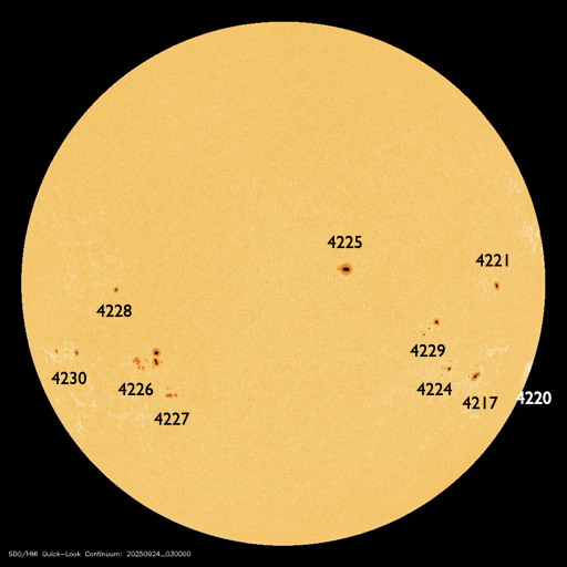 2025/ 9/24 13:04 更新 太陽風は高速の状態が続いています。イエローナイフの21日夜のオーロラをどうぞ。 担当 篠原 景山植光さんより、21日夜にカナダ・イエローナイフで撮影された オーロラの写真をいただきました。 現在の高速太陽風が始まる直前の頃で、 太陽風の速度は330km/秒と低速でしたが、 磁場強度は10nTに強まっていました。 この頃に発生した小規模の活動で、 AE指数では目立った変化は発生していませんでした。 イエローナイフでは見事なオーロラが発生していた様です。 赤と緑の色の組み合わせがとてもきれいです。 2枚目の写真では、右側に夏の大三角や夏の天の川が見えています。 実際の空での広がりが想像できます。 続きの写真を明日、明後日に掲載する予定です。 現在の太陽風は、550km/秒と高速の状態が続いています。 磁場強度は、10nTからゆっくり下がって、 5nTと平均的な値に戻っています。 コロナホールの影響が続いている様です。 磁場の南北成分は、比較的北寄りですが、 南向きにも変化していて、磁気圏の活動はある程度強まっています。 AE指数は、500〜800nTの中規模の変化が度々発生しています。 GOES衛星SUVI 195では、 コロナホールは北西の端(右上)に近付いています。 この後、太陽風の速度は低下に向かいそうです。 太陽は、南西(右下)の4217黒点群でM1.0の中規模フレア、 隣の4224群でC6.8の小規模フレア、 南東(左下)の4226群でC5.5の小規模フレアが発生しています。 特に活動的という印象はありません。