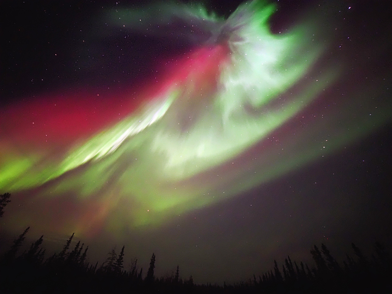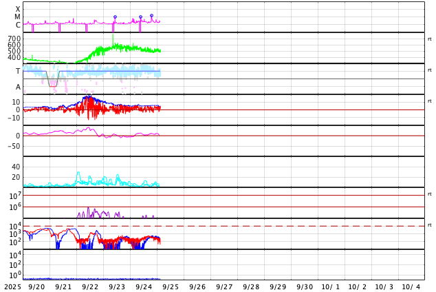 2025/ 9/25 12:27 更新 太陽風は高速ですが、終わりに向かいそうです。イエローナイフの21日夜のオーロラをどうぞ。 担当 篠原 景山植光さんよりお送りいただいた、 21日夜のカナダ・イエローナイフのオーロラ写真の続きです。 昨日の3、4枚目の続きの撮影で、 今日の4枚は、2分ほどの短い間の変化です。 真上から降り注ぐようにオーロラの光が輝いています。 赤と緑、一番下にはピンク色も見えています。 太陽風の状況は、昨日紹介した様に速度は300km/秒台と低速で、 AE指数もほとんど変化が見えていない状態でした。 その中でもイエローナイフの上空でオーロラの活動が起きていた様です。 1〜3枚目では、右端の上側にこと座、中ほどにわし座が見えています。 4枚目では、真ん中の下側にペルセウス座とプレアデス星団が見えています。 とてもきれいな写真を、ありがとうございます。 太陽風は、昨日のニュースの後、速度が500km/秒に下がり、 現在までこの速さが続いています。 高速の状態は続いていますが、 高速太陽風はこの後終わりに向かいそうです。 磁場強度は、5nTで安定しています。 磁場の南北成分は北寄りになっていて、 磁気圏は比較的穏やかです。 AE指数は小規模の変化が見られる程度です。 GOES衛星SUVI 195では、 太陽の中心部にコロナホールは見えていません。 現在の高速風が終わると、 太陽風はしばらく穏やかになりそうです。 太陽は、南西(右下)の4224黒点群で、 昨夕、24日18時半(世界時24日9時半)に、M1.0、 今朝、25日4時(世界時24日19時)に、M1.6と、 中規模フレアが2回発生しています。 また、中心部南東(左下)の4226群で、 C3.5、C5.3、C4.6と小規模フレアが続いています。