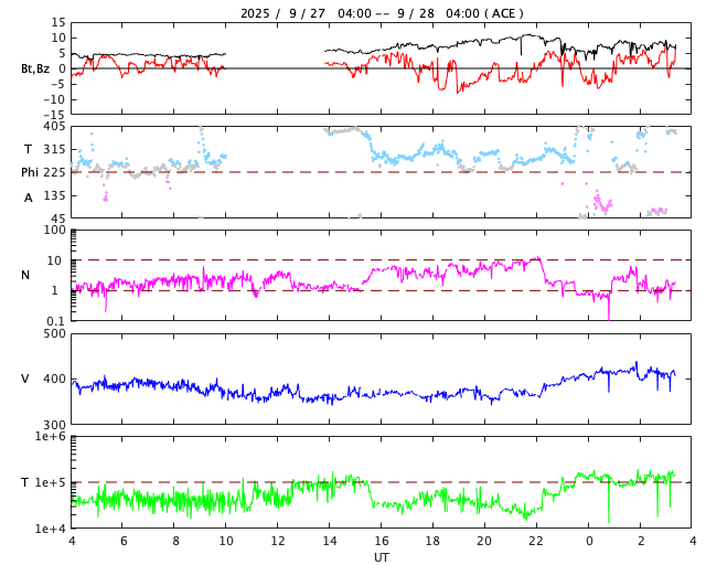 2025/ 9/28 12:32 更新 太陽風は平均的な速度で、磁気圏は概ね静穏です。 担当 篠原 太陽風の速度は、一旦360km/秒まで下がりましたが、 今朝から少し上がって、現在は410km/秒と平均的な速さに戻っています。 磁場強度は5nTから少し上がって、8nT前後で推移しています。 磁気圏は概ね静穏ですが、 太陽風の磁場が南向きに変化した頃に、 AE指数で500nTの中規模の変化が発生しています。 GOES衛星SUVI 195の太陽コロナ写真では、 東側(左側)の赤道付近と南半球側にコロナホールが見えています。 5日後くらいから、 この領域の影響で太陽風の速度が高まる可能性があります。 太陽は、北東の端(左上)に4232、4233、4235と3つの黒点群が現れています。 4232群では、M1.1、C6.8、C7.6、 4233群では、C3.2、C3.0、C7.3、C3.1、 4235群では、C5.4、 などの中規模、小規模フレアが次々に発生しています。 X線グラフでは、グラフの最後はフレアが少なくなっていますが、 この後のフレアの発生に注目して下さい。