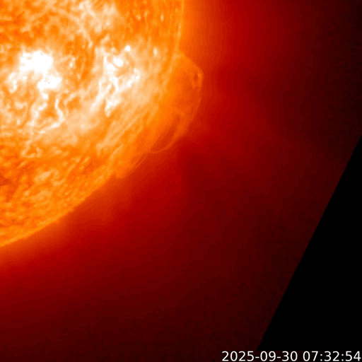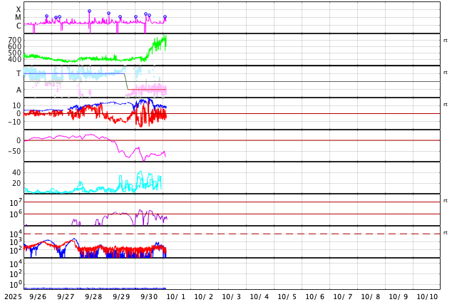 2025/10/ 1 12:31 更新 太陽風の速度が700km/秒に高まっています。磁気圏の活動も活発です。 担当 篠原 昨日のニュースの後、 太陽風の速度は400km/秒と平均的な状態が続きましたが、 磁場強度は17nT程度に強まって行きました。 そして、30日20時(世界時30日11時)になると、 速度が上昇を始めて、高速の状態になり、 今朝、1日9時(世界時1日0時)には、700km/秒に達しました。 コロナホールの影響で 太陽風の速度が高まるのではないかと予想していましたが、 だいぶ早くやって来ました。 太陽風の磁場強度は、速度が上がると10nTへ下がり、 グラフの最後は8nTとやや強まった状態です。 太陽風磁場の南北成分は、 グラフの前半では -10nTくらいの、 後半は -5nTの南向きの変化が発生しています。 速度の高まりも重なって、磁気圏の活動は活発になり、 AE指数は、1000nTに達する大きい変化が連続的に発生しています。 Dst指数も -98nTと昨日よりも大きい変化になっています。 太陽風の強まりは、この後どの様に推移するでしょうか。 GOES衛星SUVI 195の太陽コロナ写真では、 コロナホールは、太陽の西側(右側)に進んだくらいです。 太陽も活動的な状態が続いています。 30日18時半(世界時30日9時半)に、南西(右下)の4226黒点群でM2.7、 30日21時(世界時30日12時)に、左隣の4238群でM1.8、 そして、1日11時半(世界時1日2時半)に、中心部の4232群でM1.2と 中規模フレアがあちこちで発生しています。 このうち、4238群のM1.8について、 GOES衛星SUVI 131の動画を掲載します。 また、時間としてはさかのぼりますが、 30日17時(世界時30日8時)頃に、 南西の端でプロミネンス噴出が発生しています。 GOES衛星SUVI 304では、大きい噴出が見えています。 GOES衛星のCCOR-1では、 右下に広がるCME(コロナ質量放出)が観測されています。 横向きの噴出なので、地球への影響はないでしょう。 ![]() 4238黒点群で発生した、M1.8の中規模フレア。 (c) GOES衛星SUVI 131 (NOAA)、(動画加工 : 宇宙天気ニュース) ![]() 南西の端で発生したプロミネンス噴出。 (c) GOES衛星SUVI 304 (NOAA)、(動画加工 : 宇宙天気ニュース) ![]() 太陽の右下に広がるCME。 (c) GOES衛星CCOR-1 (NOAA)、(動画加工 : 宇宙天気ニュース) ![]() GOES衛星SUVI 195カメラによる太陽コロナの様子 (c) GOES衛星SUVI 195 (NOAA) ![]() SDO衛星による太陽の可視光写真。SOHO衛星のWebページより取得しました。 (c) SDO (NASA) ![]() ACEが観測した太陽風の磁場(黒線は全体の強度、赤線は南北成分) 磁場の向き、プラズマの密度、速度、温度 (c) データ:NOAA/SWPC、作図:宇宙天気ニュース ![]() AE指数(速報値) 下段のAEグラフの値が高くなると、オーロラ活動が活発化しています。 (c) 京都大学WDC ![]() ![]() 27日の太陽周期に合わせた図 太陽が同じ面を地球に向けていた27日前の変化から、今後を予想することができます。 (c) 作図:宇宙天気ニュース