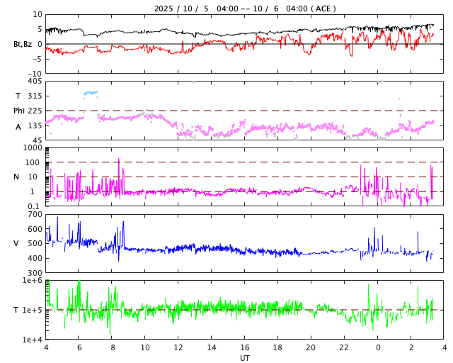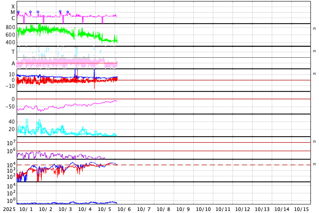 2025/10/ 4 08:57 太陽風は高速ですが、600km/秒に下がっています。磁気圏は活動的な状態です。