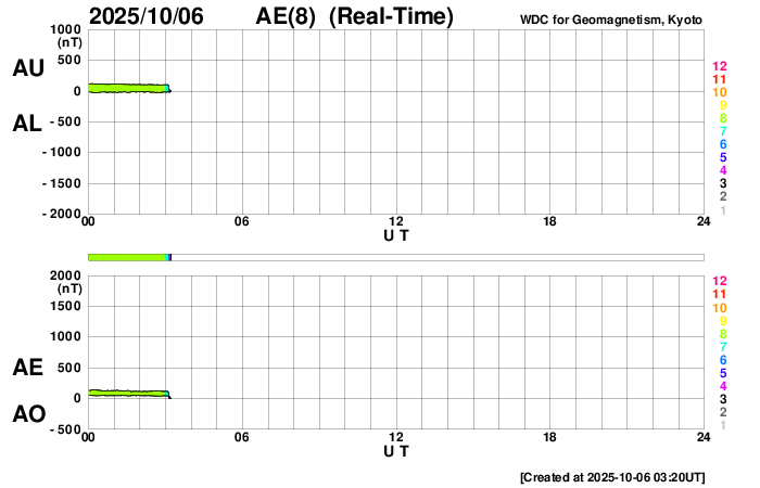 下段のAEグラフの値が高くなると、オーロラ活動が活発化しています。