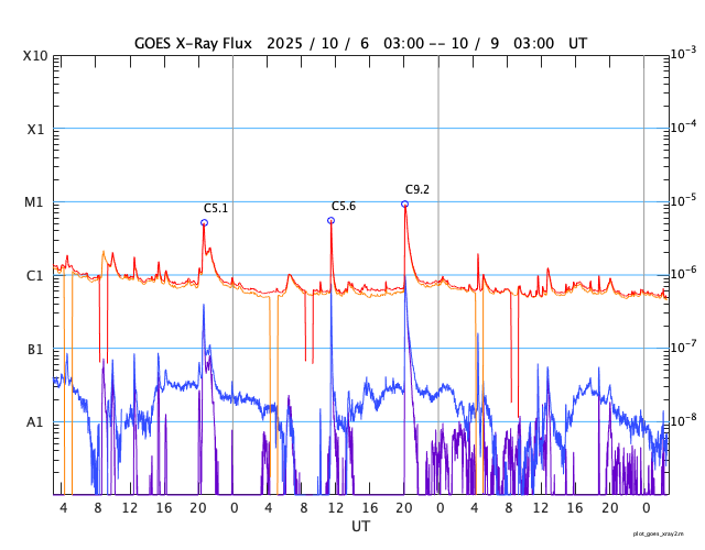 GOES衛星の太陽X線強度。赤・橙 = 0.1〜0.8 nm、青・紫 = 0.05〜0.4 nm (c) データ:NOAA/SWPC、作図:宇宙天気ニュース ![]() | ||||||||||||||||||||||||||||||||||||||||||||||||||||||||||||||||||||||||||||||||||||||||||||||||||||||||||||||||||||||||||||||||||||||||||||||||||||||||||||||||||||||||||||||||||||||||||||||||||||||||||||||||||||||||||||||||||||