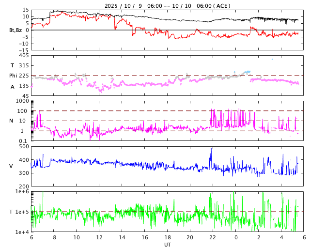 2025/10/10 14:45 更新 太陽風の速度は300km/秒とより低速になっています。 担当 篠原 太陽風の速度は、 グラフの初めに340km/秒から400km/秒に急に上がる変化が発生しています。 その後は低下が続き、現在は300km/秒に下がっています。 低速の状態です。 磁場強度も8nTから14nTに急に強まりましたが、 その後は低下して、現在は8nTに戻っています。 磁場の南北成分は、太陽風の強まりの時に北向きに大きく変化し、 その後南向きに切り替わって、 以降、-3〜 -5nT程度の南向きの状態が続いています。 速度が下がっているため影響は限定的ですが、 AE指数は、後半で400nTの小規模の変化が発生しています。 GOES衛星SUVI 195の太陽コロナ写真では、 コロナホールが西側(右側)に進んでいます。 明日くらいから太陽風の速度が高まる可能性があります。 27日周期の図を見ると、前周期は9月15日から速度が高まっていて、 これは、明後日、10月12日に相当します。 どのタイミングで変化が始まるでしょうか。 太陽は、昨夜、9日21時(世界時9日12時)に、 北西の端(右上)で、M2.0の中規模フレアが発生しました。 GOES衛星SUVI 131の動画を掲載します。 動画ではコロナの噴出が見えていますが、 CME(コロナ質量放出)は小規模でした。 その他は目立った変化は発生していません。