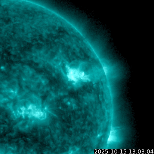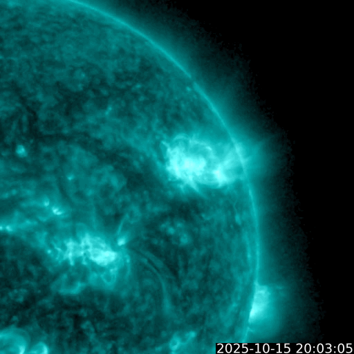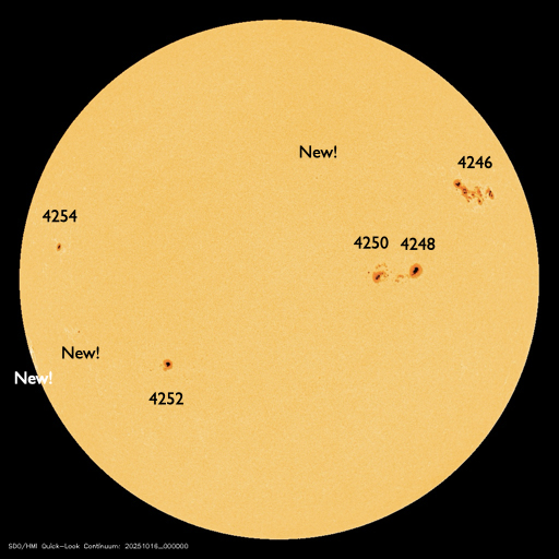 2025/10/16 11:58 更新 4246黒点群で、Mクラスフレアの発生が続いています。高速太陽風は終わりました。 担当 篠原 太陽の北西側(右上)の4246黒点群では、 活発なフレアの発生が続いています。 昨日のニュース以降では、 M3.7、M1.1、M2.7、M2.4、M1.1と 中規模フレアが5回発生しています。 15日23時(世界時14日14時)に発生したM1.1、 16日7時(世界時14日22時)のM2.7と、 その後のM2.4、M1.1のフレアの様子を、 GOES衛星SUVI 131の動画で紹介します。 これらのフレアでは、CME(コロナ質量放出)も発生していて、 SOHO衛星LASCO C2、C3では、 太陽の右上へ広がる様子が観測されています。 横向きに近い噴出なので、地球への影響はないでしょう。 4266群は、この後太陽の端に近付きます。 見えている間にどの様な活動を起こすでしょうか。 太陽風は、昨日の午後から速度はゆっくりと低下して、 550km/秒から460km/秒へ下がっています。 高速の状態は終わり、平均的な速度に戻っています。 磁場強度は、4nTから2nTへ下がり、 その後4nTに戻っています。 磁気圏は穏やかになっていて、 AE指数は、グラフの途中から変化が見られなくなっています。 GOES衛星SUVI 195では、 コロナホールが太陽の中心線に達しています。 3日後くらいから太陽風の速度が高まる可能性があります。 27日周期の図を見ると、 前周期は9月22日から速度が高まっていて、 これは、今回は10月19日に相当します。 ![]() 4246黒点群で発生した、M1.1の中規模フレア。 (c) GOES衛星SUVI 131 (NOAA)、(動画加工 : 宇宙天気ニュース) ![]() 4246黒点群で発生した、M2.7、M2.4、M1.1の中規模フレア。 (c) GOES衛星SUVI 131 (NOAA)、(動画加工 : 宇宙天気ニュース) ![]() 太陽の右上へ広がるCME。2つのフレアの動画に対応して、CMEが2回飛び出しています。 (c) SOHO衛星LASCO C2、C3 (ESA & NASA)、(動画加工 : 宇宙天気ニュース) ![]() GOES衛星SUVI 195カメラによる太陽コロナの様子 (c) GOES衛星SUVI 195 (NOAA) ![]() SDO衛星による太陽の可視光写真。SOHO衛星のWebページより取得しました。 (c) SDO (NASA) ![]() GOES衛星の太陽X線強度。赤・橙 = 0.1〜0.8 nm、青・紫 = 0.05〜0.4 nm (c) データ:NOAA/SWPC、作図:宇宙天気ニュース ![]() ACEが観測した太陽風の磁場(黒線は全体の強度、赤線は南北成分) 磁場の向き、プラズマの密度、速度、温度 (c) データ:NOAA/SWPC、作図:宇宙天気ニュース ![]() AE指数(速報値) 下段のAEグラフの値が高くなると、オーロラ活動が活発化しています。 (c) 京都大学WDC ![]() ![]() 27日の太陽周期に合わせた図 太陽が同じ面を地球に向けていた27日前の変化から、今後を予想することができます。 (c) 作図:宇宙天気ニュース