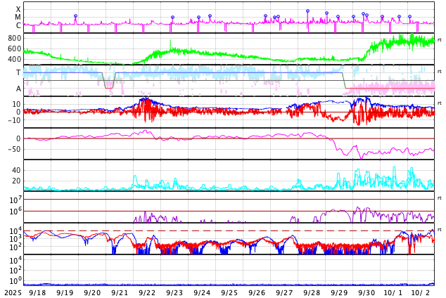 2025/10/20 10:18 更新 高速の太陽風が続いています。太陽は穏やかになりそうです。 担当 篠原 太陽風の速度は、500km/秒から550km/秒に上がり、 高速の状態が続いています。 磁場強度は、10nT前後と強まった状態で推移しています。 磁場の南北成分は、やや北寄りで推移しています。 磁気圏の活動は少し落ち着いて、 AE指数は、200〜500nTの小規模の活動が見られる程度です。 GOES衛星SUVI 195では、 コロナホールは北西側(右上)にだいぶ進んでいます。 高速太陽風は、始まって2日ほどが過ぎました。 前周期は4日ほど続いたのですが、今回はどうなるでしょうか。 太陽は、活発にフレアを起こしていた4246黒点群が 太陽の向こう側に進んだため、 X線グラフの変化は少なくなっています。 今朝、20日5時(世界時19日20時)に発生した M1.8の中規模フレアは、 向こう側に進んだ4246群で発生しています。 フレアの輝きの上の方が見えただけなので、 実際の規模はこれよりも大きかった可能性があります。 この後、太陽は穏やかに推移しそうです。