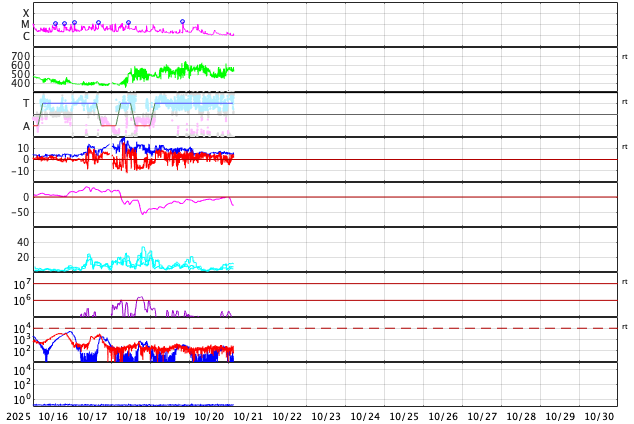 2025/10/21 12:52 更新 500km/秒台の高速太陽風が続いています。磁気圏は比較的穏やかです。 担当 篠原 太陽風は、500〜550km/秒の間で高速の状態が続いています。 磁場強度は、5〜6nTと平均的な状態です。 27日周期の図を見ると、 高速の太陽風は始まって3日が過ぎようとしています。 前周期は4日ほどで終わったのですが、 今回はもう少し続くかもしれません。 磁場の南北成分は、比較的北寄りで推移しています。 磁気圏は比較的穏やかな状態で、 AE指数は、小規模の変化が時々発生する程度です。 GOES衛星SUVI 195では、 コロナホールは北西の端(右上)に近付いています。 高速の風がどこまで続くか注目して下さい。 太陽は、北西の端(右上)の向こう側に進んだ 4246黒点群や4248群などで活動が続いている様で、 SOHO衛星LASCO C2、C3を見ると、 CME(コロナ質量放出)が太陽の右上に次々に飛び出しています。 およそ1日分の動画を掲載します。 太陽のこちら側は穏やかになっていて、 X線グラフは変化が少なくなっています。 ![]() 太陽の右上へ次々に飛び出すCME。太陽の向こう側で発生した噴出です。 (c) SOHO衛星LASCO C2、C3 (ESA & NASA)、(動画加工 : 宇宙天気ニュース) ![]() GOES衛星SUVI 195カメラによる太陽コロナの様子 (c) GOES衛星SUVI 195 (NOAA) ![]() SDO衛星による太陽の可視光写真。SOHO衛星のWebページより取得しました。 (c) SDO (NASA) ![]() ACEが観測した太陽風の磁場(黒線は全体の強度、赤線は南北成分) 磁場の向き、プラズマの密度、速度、温度 (c) データ:NOAA/SWPC、作図:宇宙天気ニュース ![]() AE指数(速報値) 下段のAEグラフの値が高くなると、オーロラ活動が活発化しています。 (c) 京都大学WDC ![]() ![]() 27日の太陽周期に合わせた図 太陽が同じ面を地球に向けていた27日前の変化から、今後を予想することができます。 (c) 作図:宇宙天気ニュース