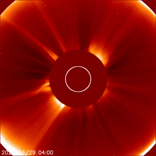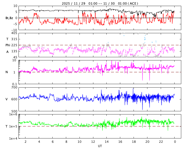 2025/11/30 10:00 更新 太陽の北東の端から活動的な領域が近づいています。太陽風は620km/秒と高速の状態です。 担当 篠原 太陽の北東の端(左上)で、活発な活動が見える様になっています。 29日14時(世界時29日5時)頃にプロミネンス噴出が発生して、 太陽の左側にCME(コロナ質量放出)が飛び出しています。 GOES衛星SUVI 304とSOHO衛星LASCO C2、C3の動画を掲載します。 そして、30日0時半(世界時29日15時半)には、 M2.8の中規模フレアが発生しています。 GOES衛星SUVI 131の動画を掲載します。 ここは、11月中旬にX5.1やX4.0などの大規模フレアを起こした 4274黒点群があった場所の様です。 可視光写真では、微かに黒点が見え始めています。 現在はどの様な状態でしょうか。 注目して下さい。 太陽の南東(左下)の4294黒点群でも活動が続いていて、 M1.5、M1.1、M1.4、M1.4と中規模フレアが発生しています。 太陽風は、620km/秒の高速の状態が安定して続いています。 磁場強度は、5〜6nTと平均的な状態です。 GOES衛星SUVI 195では、 コロナホールは南西の端(右下)に進んでほとんど見えなくなっていますが、 速度の高まりはどこまで続くでしょうか。 一方、北東のコロナホールは、太陽の中心線に近付いています。 4日後くらいから、こちらの影響が始まりそうです。 太陽風磁場の南北成分は、南寄りの変化が続いています。 磁気圏の活動は高まった状態が続いていて、 AE指数は、500nTの中規模の変化から、 1000〜1400nTの大きい変化も発生しています。 ![]() 太陽の北東の端で発生したプロミネンス噴出。 (c) GOES衛星SUVI 304 (NOAA)、(動画加工 : 宇宙天気ニュース) ![]() 太陽の左側へ広がるCME。 (c) SOHO衛星LASCO C2、C3 (ESA & NASA)、(動画加工 : 宇宙天気ニュース) ![]() 太陽の北東の端で発生した、M2.8の中規模フレア。 (c) GOES衛星SUVI 131 (NOAA)、(動画加工 : 宇宙天気ニュース) ![]() GOES衛星のSUVI 195カメラによる太陽コロナの様子 (c) NOAA/SWPC ![]() SDO衛星による太陽の可視光写真(SOHO衛星の画像ページより取得)。 マウスの矢印を写真に重ねると、黒点番号付きの写真に切り替わります。 (c) SDO (NASA) ![]() GOES衛星の太陽X線強度。赤・橙 = 0.1〜0.8 nm、青・紫 = 0.05〜0.4 nm (c) データ:NOAA/SWPC、作図:宇宙天気ニュース ![]() ACEが観測した太陽風の磁場(黒線は全体の強度、赤線は南北成分) 磁場の向き、プラズマの密度、速度、温度 (c) データ:NOAA/SWPC、作図:宇宙天気ニュース ![]() AE指数(速報値) 下段のAEグラフの値が高くなると、オーロラ活動が活発化しています。 (c) 京都大学WDC ![]() ![]() 27日の太陽周期に合わせた図 太陽が同じ面を地球に向けていた27日前の変化から、今後を予想することができます。 (c) 作図:宇宙天気ニュース