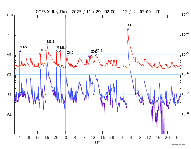 2025/12/ 2 10:50 更新 X1.9フレアのCMEが太陽の左側に広がっています。太陽風は平均的な速度に戻りました。 担当 篠原 昨日の昼、1日11時半(世界時1日2時半)に、 太陽の北東の端(左上)の4299黒点群で発生した X1.9の大規模フレアのその後の画像を含めた動画を掲載します。 1枚めはGOES衛星SUVI 131、2枚めはSUVI 304です。 131ではXフレアの強い輝きが、 304ではコロナのガスの激しい噴出がよく見えています。 CME(コロナ質量放出)の様子を、 SOHO衛星LASCO C2、C3とGOES衛星CCOR-1で紹介します。 CMEは太陽の左上に向かって激しく広がっていますが、 太陽の右側にも淡い広がりが見えている様です。 このため、太陽風の弱い乱れが地球にもやってくるかもしれません。 やって来るとすると、明日、3日の午後くらいでしょうか。 太陽風に変化が見られるかどうか注目して下さい。 また、太陽を地球よりも右斜めから観測している STEREO Ahead衛星のCOR2でも、 CMEは横向きに噴出している様に見えています。 この事も、噴出が地球寄りに広がっていることを 示しているのかもしれません。 NOAA/SWPCの太陽風予報では、 CMEは地球に対して横向きに大きく広がっています。 この広がりでは地球への影響はなさそうですが、 実際はどうなるでしょうか。 4299群は、その後は特に活動を起こしていません。 一方、南東(左下)の4294群、4296群で、 C7.9、C6.0、C4.2、C4.1などの小規模フレアが発生しています。 こちらの活動にも注目して下さい。 太陽風は、昨日のニュースの後も速度の低下が続き、 520km/秒と高速の状態から、 現在は420km/秒と平均的な速さに戻っています。 磁場強度は、5〜6nTと平均的な状態です。 11月24日に始まった高速の太陽風は、 1週間ほど続きました。 太陽風磁場の南北成分は、弱い南寄りの変化が見られます。 磁気圏の活動も強まって、 AE指数は、500nT前後の中規模の変化が続いています。 ただし、太陽風の速度が下がってきたので、 この後の磁気圏活動は、規模が小さくなるでしょう。 GOES衛星SUVI 195では、 太陽の中心部の北側にコロナホールが大きく広がっています。 明日か明後日くらいから、太陽風の速度が高まる可能性があります。
