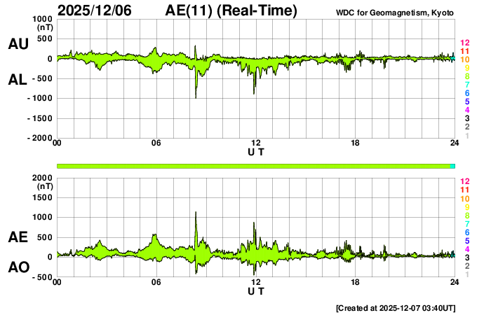 2025/12/ 7 12:47 更新 太陽風は600km/秒と高速の状態が続いています。M8.1の中規模フレアが発生しました。 担当 篠原 太陽風の速度は、700km/秒から600km/秒へゆっくり下がっていますが、 高まった状態が続いています。 磁場強度は、5〜6nTと平均的な状態です。 太陽風磁場の南北成分は、グラフの中盤以降は、 0nT付近か、北寄りになっています。 磁気圏の活動は穏やかになっていて、 AE指数は、初めの頃は500nTくらいの変化が起きていますが、 その後は変化がなくなり、穏やかな状態です。 GOES衛星SUVI 195の太陽コロナ写真では、 西の端(右端)に達したコロナホールは、 現在はほとんど見えなくなっています。 太陽風速度の高まりは、この後はどの様に推移するでしょうか。 太陽は、中心部北側の4299黒点群で、 今朝、7日4時(世界時6日19時)にM1.1、 7日5時半(世界時6日20時半)にM8.1の中規模フレアが発生しました。 GOES衛星SUVI 131の動画を掲載します。 4299群は穏やかな状態で推移していたので、 急な活動の発生に見えました。 この後はどうなるでしょうか。 このフレアに伴って、CME(コロナ質量放出)が発生しています。 GOES衛星CCOR-1を見ると、 コロナのガスは淡いですが、太陽を丸く囲む様に広がっています。 また、太陽を地球よりも右斜めから観測している STEREO Ahead衛星COR2では、 CMEは地球のある左側に噴出しています。 このため、太陽風の乱れは地球にやって来そうです。 到来まで2〜3日くらいかかると考えると、 9日か10日頃でしょうか。 NOAA/SWPCの太陽風予報などの情報に注目して下さい。 太陽風の乱れが到来して、太陽風の磁場が南向きに強まると、 オーロラなどの磁気圏の活動が活発になります。 今回のCMEはあまり激しい噴出ではない様に感じます。 それでも磁場が強まると活動は激しくなる可能性があるので注目して下さい。