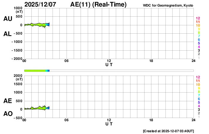 (c) GOES衛星SUVI 131 (NOAA)、(動画加工 : 宇宙天気ニュース) ![]() CMEは太陽を丸く囲むように広がっています。 (c) GOES衛星CCOR-1 (NOAA)、(動画加工 : 宇宙天気ニュース) ![]() 太陽を地球よりも右斜めから観測しているSTEREO Ahead衛星COR2によるCME。 (c) STEREO Ahead衛星COR2 (NASA)、(動画加工 : 宇宙天気ニュース) ![]() GOES衛星のSUVI 195カメラによる太陽コロナの様子 (c) NOAA/SWPC ![]() SDO衛星による太陽の可視光写真(SOHO衛星の画像ページより取得)。 マウスの矢印を写真に重ねると、黒点番号付きの写真に切り替わります。 (c) SDO (NASA) ![]() ACEが観測した太陽風の磁場(黒線は全体の強度、赤線は南北成分) 磁場の向き、プラズマの密度、速度、温度 (c) データ:NOAA/SWPC、作図:宇宙天気ニュース ![]() AE指数(速報値) 下段のAEグラフの値が高くなると、オーロラ活動が活発化しています。 (c) 京都大学WDC ![]() ![]() 27日の太陽周期に合わせた図 太陽が同じ面を地球に向けていた27日前の変化から、今後を予想することができます。 (c) 作図:宇宙天気ニュース