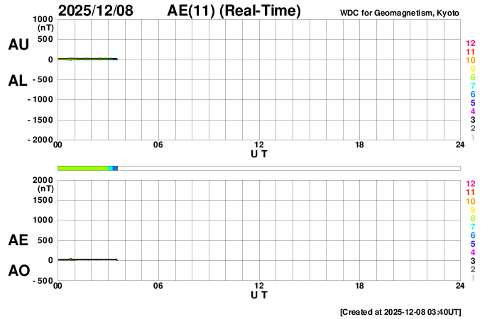 2025/12/ 8 12:43 更新 太陽風は、400km/秒と平均的な速度に戻っています。 担当 篠原 太陽風の速度は、昨日のニュース以降は低下が続き、 600km/秒と高速の状態から、 現在は400km/秒と平均的な速さに戻っています。 磁場強度は、6nTから7nTへ少し上がっています。 磁場の南北成分は、北寄りになっています。 磁気圏は穏やかになっていて、 AE指数は、グラフの後半は変化が見られなくなっています。 GOES衛星SUVI 195では、 北東の端(左上)にコロナホールが微かに見えている程度です。 CME(コロナ質量放出)の影響を除くと、 太陽風は穏やかに推移しそうです。 昨日、7日の朝に4299黒点群で発生した、 M1.1とM8.1の中規模フレアの時に発生した CMEによる太陽風の乱れについて、 NOAA/SWPCの予報が公開されています。 これによると、太陽風の乱れは、 明日の午後、9日15時(世界時9日6時)頃に 地球に到来する可能性があるとのことです。 この場合、フレアの発生から2日半ほどかかることになり、 速度の高まりは、普通の高速風くらいになりそうです 磁場が大きく強まって、南向きに変化すると磁気圏の活動は活発になります。 どの様な乱れが到来するか、注目して下さい。 太陽は、中心部北側の4299群でM2.4、 南西(右下)の4294群でM2.0の中規模フレアが発生しています。 4294群は、左の4296群とともに、 Cクラスの小規模フレアを頻繁に起こしています。 フレアの規模が大きくなる様であれば、注目して下さい。