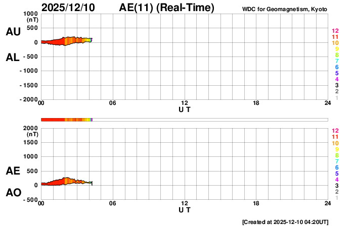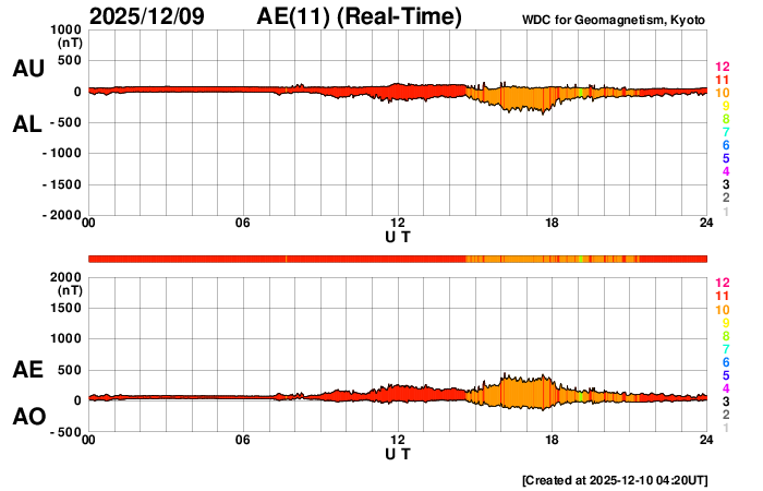 2025/12/10 13:22 更新 太陽風は低速で、磁気圏は穏やかです。フレアの発生が続いています。 担当 篠原 太陽風の速度は、380km/秒から330km/秒へゆっくり下り、 グラフの最後で380km/秒へ上がっています。 低速の状態が続いています。 磁場強度は、7nTからグラフの途中で9nTに強まり、 その後5nTへ下がって、最後で10nTを超えるくらいに上がっています。 細かい乱れがやって来ている様です。 磁場の南北成分は、弱い南寄りが続いていますが、 速度が下がっているため、磁気圏は基本的に穏やかで、 AE指数は、グラフの途中で 300nTの小規模の変化が起きている程度です。 太陽風のグラフの最後で、 磁場の南北成分は0nT付近に上がっています。 この状態が続くと、磁気圏は穏やかな状態が続くでしょう。 GOES衛星SUVI 195では、 北半球のコロナホールが太陽の中心線に達しています。 3日後くらいから、太陽風速度の高まりが始まる可能性があります。 コロナホールは高緯度側に広がっています。 どの程度の影響がやって来るでしょうか。 太陽は、南西(右下)の4294黒点群で、 M1.6、M1.5の中規模フレアや、 C6.0、C5.6、C5.0、C7.8、C8.0、C9.5などの 小規模フレアが多く発生しています。 また、左側の4296群でも、M1.5の中規模フレアが発生しています。 太陽の西の端(右端)に近づいていますが、 見えている間は注目して下さい。 ![]() GOES衛星のSUVI 195カメラによる太陽コロナの様子 (c) NOAA/SWPC ![]() SDO衛星による太陽の可視光写真(SOHO衛星の画像ページより取得)。 マウスの矢印を写真に重ねると、黒点番号付きの写真に切り替わります。 (c) SDO (NASA) ![]() ACEが観測した太陽風の磁場(黒線は全体の強度、赤線は南北成分) 磁場の向き、プラズマの密度、速度、温度 (c) データ:NOAA/SWPC、作図:宇宙天気ニュース ![]() AE指数(速報値) 下段のAEグラフの値が高くなると、オーロラ活動が活発化しています。 (c) 京都大学WDC ![]() ![]() 27日の太陽周期に合わせた図 太陽が同じ面を地球に向けていた27日前の変化から、今後を予想することができます。 (c) 作図:宇宙天気ニュース