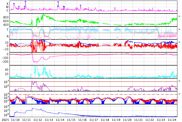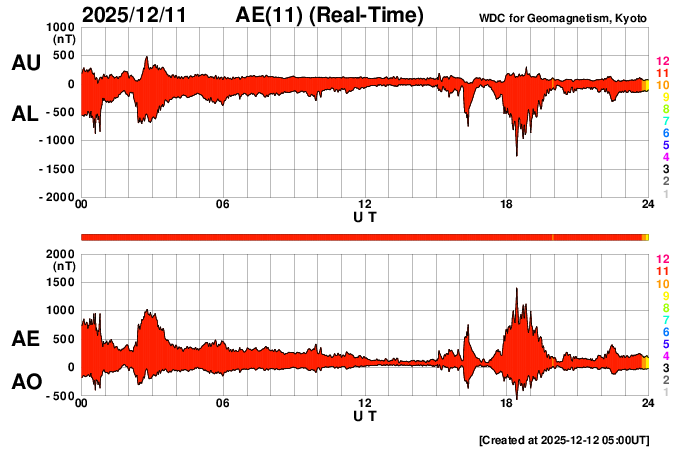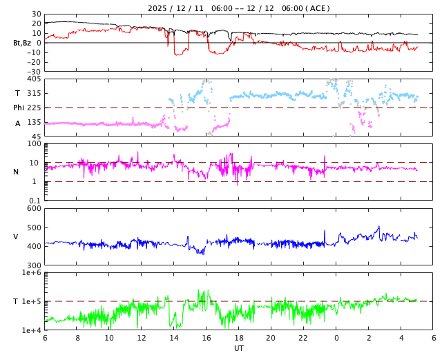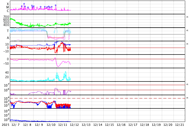 2025/12/12 14:18 更新 太陽風磁場の強まりは下がって来ました。速さは平均的な状態です。 担当 篠原 太陽風の速度は、410km/秒から450km/秒に少し上がっています。 速さとしては平均的な状態です。 磁場強度は、昨夜までは20nTに強まっていましたが、 今朝にかけて10nTに下がり、現在もこの値です。 値は下がりましたが、強まった状態は続いています。 磁場の南北成分は、グラフの前半は北向きでしたが、 後半から南向きになって、-10nT近い強まりになっています。 磁気圏の活動は限定的で、 AE指数は、グラフの後半に1300nTの大きい変化が起きていますが、 その前後は小さい変化に留まっています。 GOES衛星SUVI 195では、 北半球のコロナホールは西側(右側)に進み、 明日くらいから影響が始まるかもしれません。 広がりは高緯度側に伸びて、東側(左側)で再び低緯度側に下がっています。 この間、太陽風の速度はどのように変化するでしょうか。 太陽は、南西の端(右下)に達した4294黒点群で、 C9.7と大きい小規模フレアが発生しています。 また、隣の4296群で、 ちょうど今、M2.0の中規模フレアが発生しました。 X線グラフの最後の高まりです。 これらの領域が太陽の向こう側に進むと、 太陽は穏やかになりそうです。