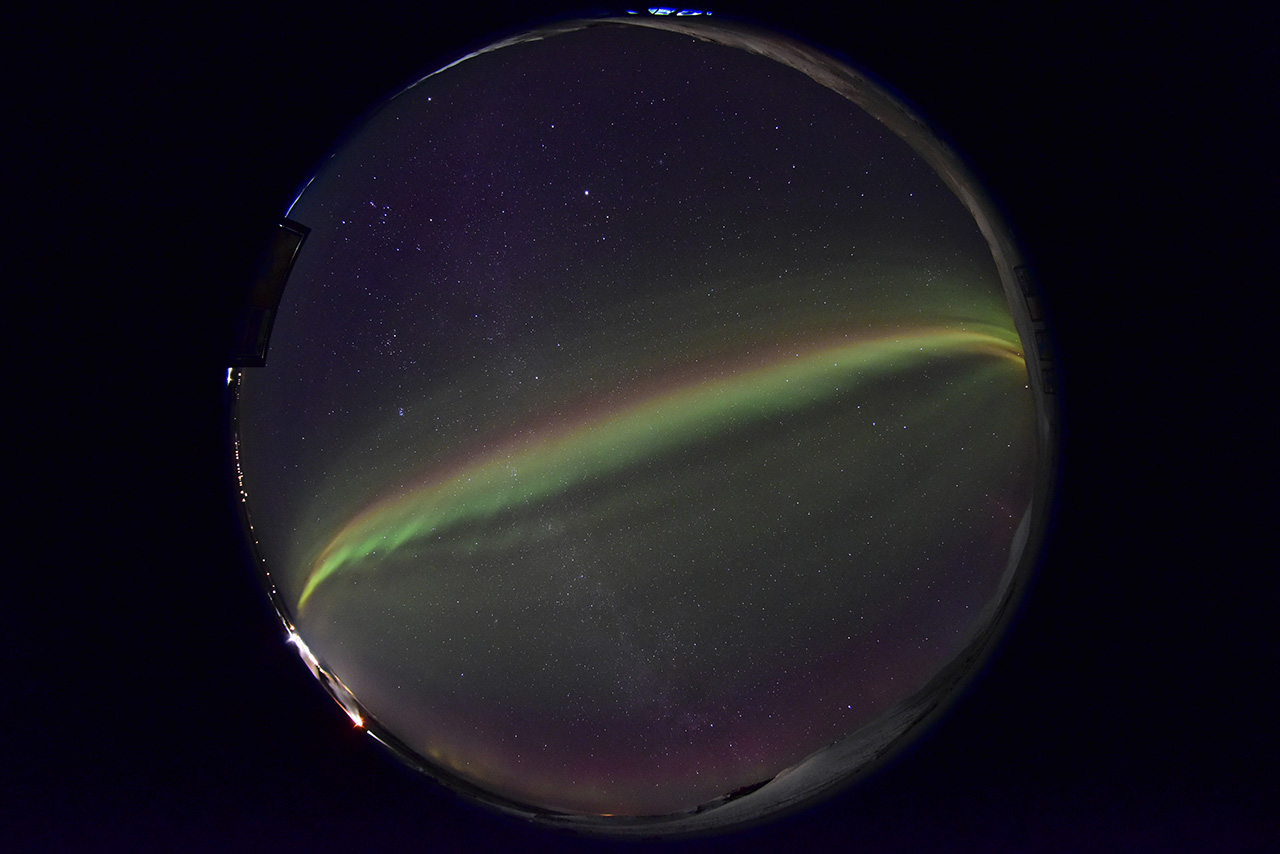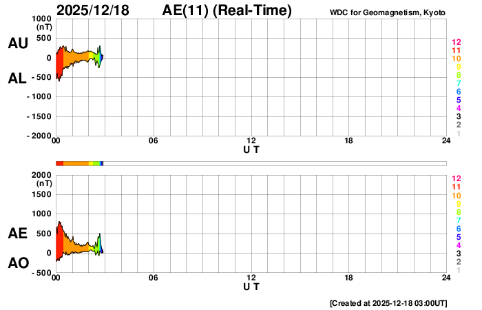 2025/12/18 12:13 更新 太陽風は650km/秒と高速です。アイスランドのオーロラをどうぞ。 担当 篠原 アイスランドに滞在中の藤井哲也さんと高家幹夫さんより、 現地17日未明に撮影されたオーロラの写真をいただきました。 撮影場所は、アイスランド北部にあるミーバトン湖とのことです。 撮影の頃は、太陽風の速度は600km/秒と高まっていたのですが、 磁場の南向きの変化が少なく、AE指数はほとんど変化のない穏やかな状況でした。 藤井さんによると、 オーロラは強くなったり弱くなったりを繰り返していたとのことで、 強い活動にはなっていなかった様です。 1枚目の写真は、魚眼レンズによる全天の写真です。 東側から昇ったオーロラと西側から昇ったオーロラが、 やがてこの写真の様に、きれいに一つに繋がったとのことです。 緑色の光から赤色の光へ上がっていく様子がとてもきれいです。 左上の低空にオリオン座が見えています。 さすが高緯度地域です。 その後、つながったオーロラが動き始めて、太くなり(2枚目)、 強くなったり弱くなったりを繰り返していたそうです(3枚目)。 現地は快晴で、気温はマイナス13度まで下がっていたそうです。 きれいなオーロラの姿をありがとうございます。 太陽風の速度は、600km/秒から650km/秒へ再び高まっています。 SDO衛星AIA195を見ると、南北に縦に伸びるコロナホールは、 西側(右側)にだいぶ進んでいて、この領域の影響がやって来ているようです。 太陽風の磁場強度は、5nT前後と平均的な状態です。 磁場の南北成分は、南北に変化していて、 -5nT程度の南向きの変化も発生しています。 このため、磁気圏の活動は強まっていて、 AE指数は、途中から500nT程度の変化が発生するようになり、 後半では800nTと中規模の変化に達しています。 今回の太陽風速度の高まりに関係していると思われる 太陽の西側のコロナホールは、 縦に伸びていて横方向の広がりは小さいです。 このため、太陽風の高速の状態はあまり長く続かない様に思います。 この後の速度の変化に注目してください。 また、東側(左側)に次のコロナホールが見えています。 5日後くらいから、この領域の影響が始まりそうです。 太陽のX線強度のグラフは、変化が少なくなっています。 太陽は穏やかな状態です。 可視光写真では、北東の端(左上)に新しい黒点群が現れていますが、 特に活動は起こしていません。