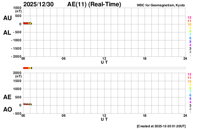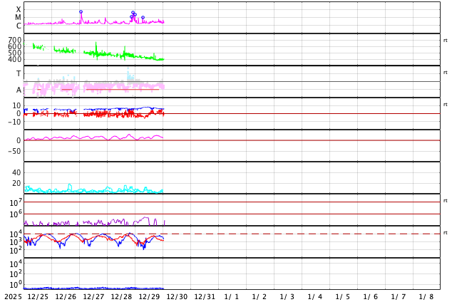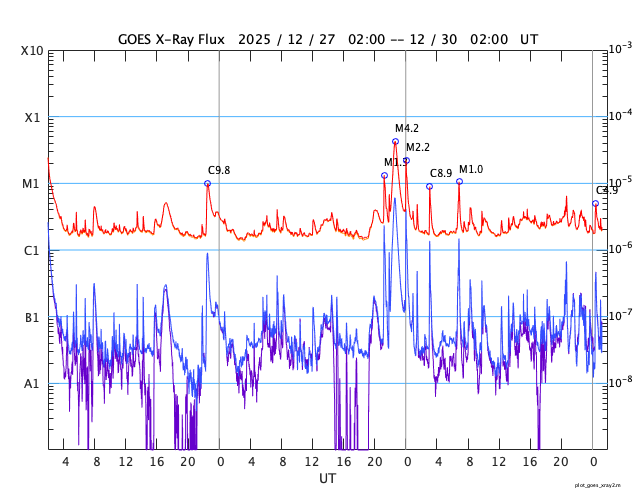 2025/12/30 10:22 更新 太陽風の速度は390km/秒に下がり、やや低速です。磁気圏は穏やかです。 担当 篠原 昨日のニュースで紹介した、太陽の北西(右上)の4317黒点群で 29日7時(世界時28日22時)に発生したM4.2中規模フレアに伴って発生した CME(コロナ質量放出)の動画を掲載します。 これを見ると、コロナのガスは太陽の右上に広がっています。 NOAA/SWPCの太陽風予報では、 CMEは地球に対して斜め方向に飛び出していて、 噴出の端の方が1月1日14時(世界時1日5時)頃に 地球にやって来る可能性があるとのことです。 影響は小さいものになりそうです。 太陽では、その後、北東(左上)の4324群でC8.9の小規模フレア、 南東(左下)の4325群でM1.0の中規模フレアが発生していますが、 X線グラフの後半は変化が少なくなっていて、 活動は落ち着いている様です。 太陽風は、速度が430km/秒から390km/秒へ下がり、 やや低速になっています。 磁場強度は、6〜8nTでゆっくり変化しています。 磁場の南北成分は、 グラフの前半は南寄り、後半はやや北寄りになっています。 AE指数では、前半に500nT前後の小・中規模の変化が起きていますが、 後半は変化がなくなっていて、現在の磁気圏は穏やかです。 SDO衛星AIA193では、 北半球のコロナホールが西側(右側)に進んでいます。 明日くらいから太陽風の速度が高まりそうです。 ![]() 29日7時(世界時28日22時)のM4.2中規模フレアに伴って発生したCME。 (c) SOHO衛星LASCO C2、C3 (ESA & NASA)、(動画加工 : 宇宙天気ニュース) ![]() CMEによる太陽風の乱れは、1月1日14時(世界時1日5時)頃に地球に到来する可能性があります。 (c) WSA-ENLIL太陽風予報 (NOAA)、(動画加工 : 宇宙天気ニュース) ![]() SDO衛星のAIA193カメラによる太陽コロナの様子 (c) SDO (NASA) ![]() SDO衛星による太陽の可視光写真。マウスの矢印を写真に重ねると、黒点番号付きの写真に切り替わります。 (c) SDO (NASA) ![]() GOES衛星の太陽X線強度。赤・橙 = 0.1〜0.8 nm、青・紫 = 0.05〜0.4 nm (c) データ:NOAA/SWPC、作図:宇宙天気ニュース ![]() ACEが観測した太陽風の磁場(黒線は全体の強度、赤線は南北成分) 磁場の向き、プラズマの密度、速度、温度 (c) データ:NOAA/SWPC、作図:宇宙天気ニュース ![]() AE指数(速報値) 下段のAEグラフの値が高くなると、オーロラ活動が活発化しています。 (c) 京都大学WDC ![]() ![]() 27日の太陽周期に合わせた図 太陽が同じ面を地球に向けていた27日前の変化から、今後を予想することができます。 (c) 作図:宇宙天気ニュース