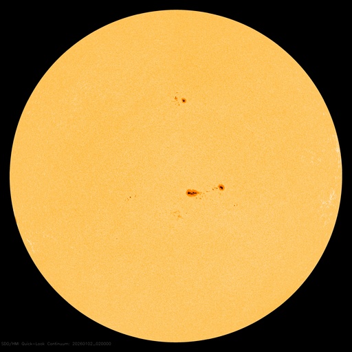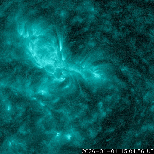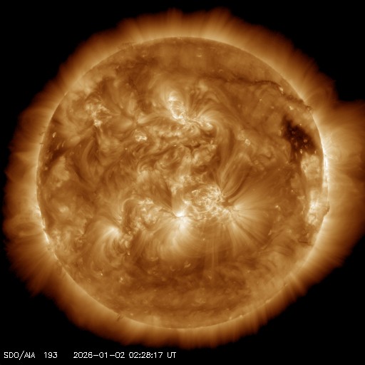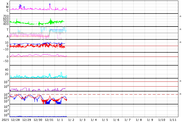 2026/ 1/ 2 12:00 更新 太陽風はやや高速です。C6.2の小規模フレアによりハロー型のCMEが発生しています。 担当 篠原 昨日のニュースの後、太陽風の速度は460km/秒に少し下がり、 その後再び上がって、480km/秒とやや高速の状態に戻っています。 SDO衛星AIA193の太陽コロナ写真を見ると、 北半球のコロナホールは、北東の端(右上)に近付いていて、 今回の太陽風速度の高まりは、この程度で終わりそうです。 27日周期の図を見ると、 前周期の太陽風速度は600km/秒台に高まっていたのですが、 今回はこの高まりがほとんど消えた様になっています。 太陽風の磁場強度は、 10nTに近い状態から、7nT程度へ下がっている様です。 南北成分は、グラフの前半は北寄りですが、 途中から南寄りで変化する様になっています。 磁気圏の活動もこの影響で少し強まっていて、 AE指数は、600nTの中規模の変化が続く様になっています。 SDO衛星AIA193の太陽の中心部にはコロナホールは見られず、 この後、太陽風の速度は低下して、 穏やかな状態がしばらく続きそうです。 太陽では、今日未明、2日2時半(世界時1日17時半)に、 中心部北側(上側)の4324黒点群で、C6.2の小規模フレアが発生しました。 SDO衛星AIA131の動画を掲載します。 この動画では、フレアに伴ってコロナのガスが飛び出す様子が見えています。 GOES衛星CCOR1では、CME(コロナ質量放出)が観測されています。 CMEは、太陽の左上に濃く広がっていますが、 左下や右側にも淡く飛び出す様子が見えていて、 ハロー型のCMEになっている様です。 フレアの発生位置から考えても、 CMEの噴出は地球にも向かっているのではないでしょうか。 到来まで3日くらいかかると考えると、5日の午前中くらいでしょうか。 X線グラフの最後で、C6.5の小規模フレアが発生しています。 太陽の中心部南東側(左下)の黒点群で発生しています。