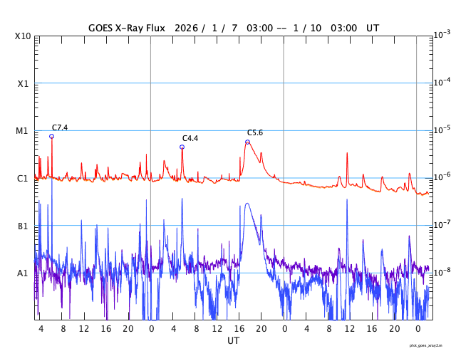 GOES衛星の太陽X線強度。赤・橙 = 0.1〜0.8 nm、青・紫 = 0.05〜0.4 nm (c) データ:NOAA/SWPC、作図:宇宙天気ニュース ![]() | |||||||||||||||||||||||||||||||||||||||||||||||||||||||||||||||||||||||||||||||||||||||||||||||||||||||||||||||||||||||||||||||||||||||||||||||||||||||||||||||||||||||||||||||||||||||||||||||||||||||||||||||||||||||||||||||||||||||||||