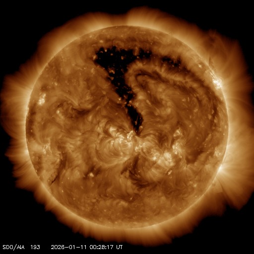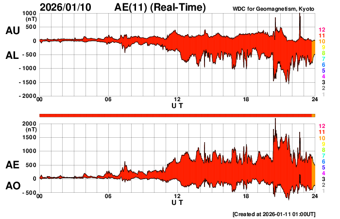 2026/ 1/11 10:05 更新 CMEによる太陽風の乱れが到来しました。磁場が南向きに強まって磁気圏の活動が強まりました。 担当 篠原 9日未明のCME(コロナ質量放出)による太陽風の乱れが、 今朝、11日4時半(世界時10日19時半)にACE衛星で観測され、 太陽風の速度は600km/秒に高まりました。 昨日のニュースの後も、 太陽風の速度は480km/秒とやや高速の状態が続きました。 磁場強度は6〜8nTと少し強まっていたのですが、 磁場の南北成分が10日13時(世界時10日4時)頃から南向きの傾向になり、 -7nT前後の状態が今朝にかけて続きました。 このため、磁気圏の活動は強まって、 AE指数は、グラフの途中から 1000nTに達する大きい変化が連続的に発生しています。 ここにCMEによる太陽風の乱れが到来して、 速度は600km/秒に、磁場強度は15nTに高まりました。 磁場の南北成分は、-10nTと南向きにさらに強まっています。 磁気圏の活動も規模が大きくなって、 AE指数は1500nTに達する激しい変化が発生しています。 乱れの到来から5時間ほど経った現在では、 太陽風の速度は520km/秒と、高速ですが勢いは下がっています。 磁場強度は、一旦7nTに下がりましたが、 グラフの最後で再び15nTに強まっています。 ただし、磁場の南北成分は北向きに変化していて 磁気圏への影響は下がっています。 AE指数もグラフの最後は500nTの変化に下がっています。 CMEによる太陽風の乱れは長くは続かないと思われるので、 太陽風はこの後、到来前の状態に戻って行きそうです。 一方、SDO衛星AIA193では、 北半球を縦に伸びるコロナホールが太陽の中心線付近で見えています。 この広がりの影響が3日後くらいに地球に到来して、 太陽風の速度が高まりそうです。 太陽は、北西の端(右上)近くの4337黒点群で、 C3.8、C2.0の小規模フレアが発生しています。 可視光写真では、東側(左側)に黒点はなく、 太陽は穏やかに推移しそうです。