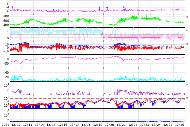 (c) SDO衛星AIA171 (NASA)、(動画加工 : 宇宙天気ニュース) ![]() SDO衛星のAIA193カメラによる太陽コロナの様子 (c) SDO (NASA) ![]() SDO衛星による太陽の可視光写真。マウスの矢印を写真に重ねると、黒点番号付きの写真に切り替わります。 (c) SDO (NASA) ![]() GOES衛星の太陽X線強度。赤・橙 = 0.1〜0.8 nm、青・紫 = 0.05〜0.4 nm (c) データ:NOAA/SWPC、作図:宇宙天気ニュース ![]() ACEが観測した太陽風の磁場(黒線は全体の強度、赤線は南北成分) 磁場の向き、プラズマの密度、速度、温度 (c) データ:NOAA/SWPC、作図:宇宙天気ニュース ![]() AE指数(速報値) 下段のAEグラフの値が高くなると、オーロラ活動が活発化しています。 (c) 京都大学WDC ![]() ![]() 27日の太陽周期に合わせた図 太陽が同じ面を地球に向けていた27日前の変化から、今後を予想することができます。 (c) 作図:宇宙天気ニュース