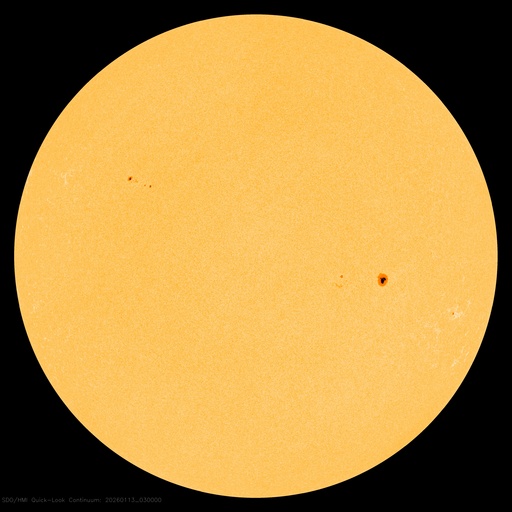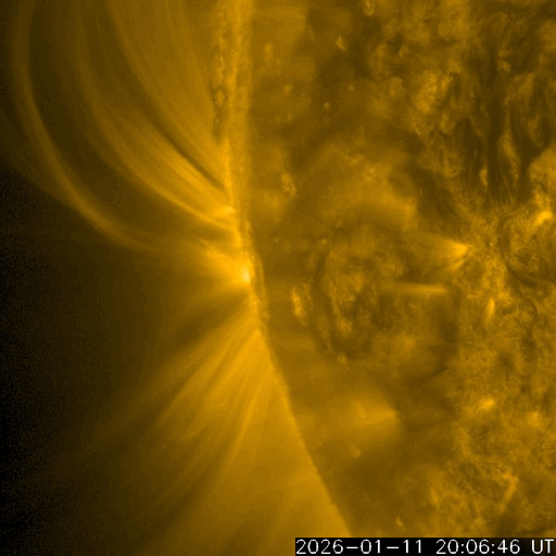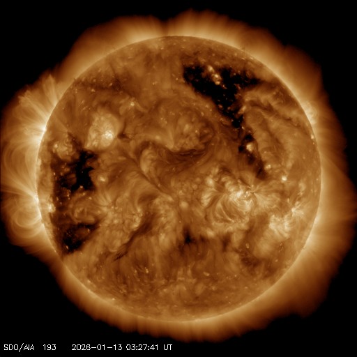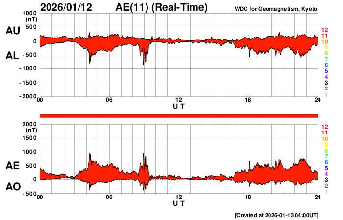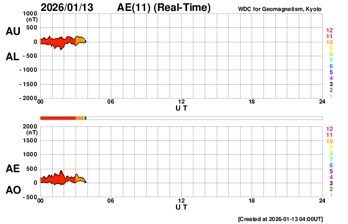 2026/ 1/13 13:17 更新 太陽は穏やかです。太陽風の速度は580km/秒に高まっています。 担当 篠原 昨日のニュースで紹介したM3.3の中規模フレアでは、 フレアの後にポストフレアループが綺麗に見えていました。 SDO衛星AIA171の動画で紹介します。 その後の太陽は、中心部南西側(右下)の4336黒点群で C5.2の中規模フレアが発生しています。 しかし、その他は目立った活動はなく、 M3.3フレアが発生した南東の端(左下)も特に変化はありません。 太陽風は、速度が520km/秒から580km/秒へ一段高まっています。 磁場強度は、7nT付近で安定しています。 磁場の南北成分は、 南寄りから0nT付近に変わり、再び南寄りに傾向が変化しています。 磁気圏の活動も対応していて、AE指数を見ると、 初めに500nTを超えるくらいの中規模の活動が発生して、 穏やかな状態がしばらく続き、 後半で再び500nTくらいの中規模の変化が発生しています。 太陽風のグラフの最後では、磁場は北向きに変化しています。 この後はどちら寄りで推移するでしょうか。 SDO衛星AIA193では、 北半球のコロナホールは、北西側(右上)に進んでいます。 太陽風の速度の高まりは、もうしばらく続きそうです。 そして、南東の端に新しいコロナホールが姿を表しています。 この領域は27日前にもあって、 27日周期の図では12月21日から太陽風の速度が高まっています。 この場合、今回は1月17日から速度が高まるかもしれません。 注目して下さい。