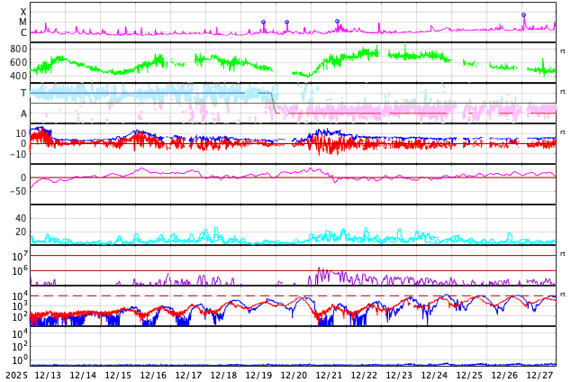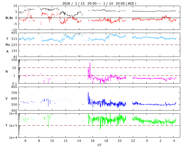 2026/ 1/14 13:35 更新 太陽風は高速の状態が続いています。磁気圏は比較的穏やかです。 担当 篠原 太陽風は、速度が580km/秒から500km/秒へ少し下がっていますが、 高速の状態が続いています。 磁場強度は、上下の変化がありますが、 5〜6nTと平均的な値で推移しています。 磁場の南北成分は、グラフの途中から弱い南寄りになっています。 磁気圏では時々活動が発生していて、 AE指数は、400nTくらいの小規模の変化が時間をおいて発生しています。 全体としては比較的穏やかな状態です。 SDO衛星AIA193では、 北半球のコロナホールは北西側(右上)側にだいぶ進んでいます。 この後、太陽風の強まりが見られるでしょうか。 一方、南東側(左下)にコロナホールの大きい広がりが見えています。 広がりの位置から考えると、速度の高まりは4〜5日後になりそうですが、 27日周期の図の前周期の変化を参考にすると、 もう少し早く、3日後の17日から始まりそうです。 太陽は、東端(左端)の南北から活動的な領域が近づいている様で、 南側では黒点が見え始め、C2.4の小規模フレアが発生しています。 そして、北側ではX線グラフの最後で、 C9.6とMクラス寸前の小規模フレアが発生しました。 この後、どのような領域が現れるでしょうか。 また、太陽では、今朝、14日4時(世界時13日19時)頃に、 北の端の向こう側でプロミネンス噴出が発生しました。 GOES衛星SUVI 304の動画を掲載します。 SOHO衛星LASCO C2では、 CME(コロナ質量放出)も観測されています。 ![]() 太陽の向こう側で発生したプロミネンス噴出。 (c) GOES衛星SUVI 304 (NOAA)、(動画加工 : 宇宙天気ニュース) CMEが太陽の上側に広がっています。 (c) SOHO衛星LASCO C2 (ESA & NASA)、(動画加工 : 宇宙天気ニュース) ![]() SDO衛星のAIA193カメラによる太陽コロナの様子 (c) SDO (NASA) ![]() SDO衛星による太陽の可視光写真。マウスの矢印を写真に重ねると、黒点番号付きの写真に切り替わります。 (c) SDO (NASA) ![]() ACEが観測した太陽風の磁場(黒線は全体の強度、赤線は南北成分) 磁場の向き、プラズマの密度、速度、温度 (c) データ:NOAA/SWPC、作図:宇宙天気ニュース ![]() AE指数(速報値) 下段のAEグラフの値が高くなると、オーロラ活動が活発化しています。 (c) 京都大学WDC ![]() ![]() 27日の太陽周期に合わせた図 太陽が同じ面を地球に向けていた27日前の変化から、今後を予想することができます。 (c) 作図:宇宙天気ニュース