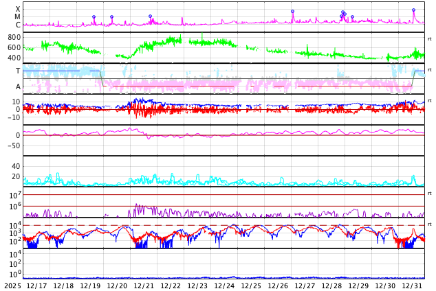 GOES衛星の太陽X線強度。赤・橙 = 0.1〜0.8 nm、青・紫 = 0.05〜0.4 nm (c) データ:NOAA/SWPC、作図:宇宙天気ニュース ![]() | |||||||||||||||||||||||||||||||||||||||||||||||||||||||||||||||||||||||||||||||||||||||||||||||||||||||||||||||||||||||||||||||||||||||||||||||||||||||||||||||||||||||||||||||||||||||||||||||||||||||||||||||||||||||||||||||||||||||||||||||||||||||||||||||||