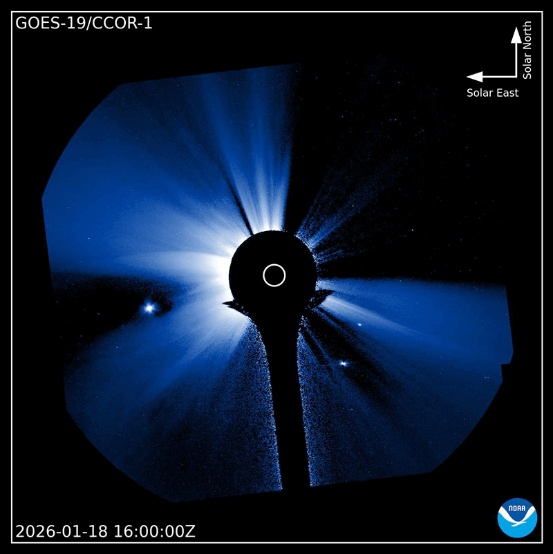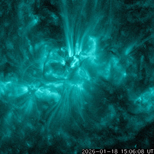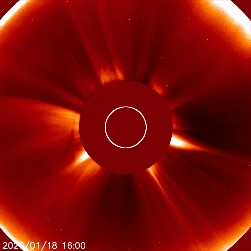 2026/ 1/19 10:13 更新 X1.9の大規模フレアが発生しました。ハロー型のCMEが発生し、太陽風の乱れが地球に向かっています。 担当 篠原 今日未明、19日2時半(世界時18日17時半)に、 太陽中心部南東(左下)の4341黒点群で、 X1.9の大規模フレアが発生しました。 SDO衛星AIA131の動画を掲載します。 Xクラスのフレアの発生は、 12月8日のX1.1以来で、およそ1か月半ぶりです。 X線グラフは、強度の高まりが長く続いています。 この場合はCME(コロナ質量放出)を伴うことが多く、 GOES衛星CCOR-1やSOHO衛星LASCO C2、C3では、 太陽を丸く囲む様に広がるハロー型のCMEが観測されています。 それぞれ動画を掲載します。 GOES衛星CCOR-1では、画面の右下に新月が飛び込んでいます。 また、SOHO衛星LASCO C3(青い写真)では、 太陽の左下に金星、右下の上側に火星、下側に水星が明るく見えています。 フレアは太陽の中心付近で発生しているので、 太陽風の乱れは地球の方向に向かっていると考えられます。 到来まで2日くらいかかると考えると、 明日、20日の夜から明後日、21日の午前中にかけてでしょうか。 速度が高まり、磁場が南向きに大きく変化すると、 磁気圏の活動が激しくなります。 天気が心配ですが、 時間帯が良ければ低緯度オーロラが観測されるかもしれません。 この後発表される、NOAA/SWPCの太陽風予報にも注目して下さい。 引き続き、4341黒点群の活動に注目して下さい。 太陽風は、速度が680km/秒から500km/秒へ下がっています。 高速の状態は続いています。 磁場強度は、8nT前後とやや強まった状態です。 磁場の南北成分は、グラフの途中から南向きに変化しています。 磁気圏の活動は高まった状態が続いて、 AE指数は、500〜800nTの中規模の変化が連続的に発生しています。 SDO衛星AIA193では、 コロナホールが太陽の西側(右側)に進んでいて、 この領域の影響が本格化しそうです。 今回は、この高速風に重なる形でCMEの乱れがやって来るので、 太陽風の乱れはより大きくなるかもしれません。 注目して下さい。 ![]() 4341黒点群で発生した、X1.9の大規模フレア。 (c) SDO衛星AIA131 (NASA)、(動画加工 : 宇宙天気ニュース) ![]() 太陽を丸く囲む様に広がるハロー型のCMEが発生しました。 (c) GOES衛星CCOR-1 (NOAA)、(動画加工 : 宇宙天気ニュース) ![]() CMEが大きく広がっています。 (c) SOHO衛星LASCO C2、C3 (ESA & NASA)、(動画加工 : 宇宙天気ニュース) ![]() SDO衛星のAIA193カメラによる太陽コロナの様子 (c) SDO (NASA) ![]() SDO衛星による太陽の可視光写真。マウスの矢印を写真に重ねると、黒点番号付きの写真に切り替わります。 (c) SDO (NASA) ![]() GOES衛星の太陽X線強度。赤・橙 = 0.1〜0.8 nm、青・紫 = 0.05〜0.4 nm (c) データ:NOAA/SWPC、作図:宇宙天気ニュース ![]() ACEが観測した太陽風の磁場(黒線は全体の強度、赤線は南北成分) 磁場の向き、プラズマの密度、速度、温度 (c) データ:NOAA/SWPC、作図:宇宙天気ニュース ![]() AE指数(速報値) 下段のAEグラフの値が高くなると、オーロラ活動が活発化しています。 (c) 京都大学WDC ![]() ![]() 27日の太陽周期に合わせた図 太陽が同じ面を地球に向けていた27日前の変化から、今後を予想することができます。 (c) 作図:宇宙天気ニュース