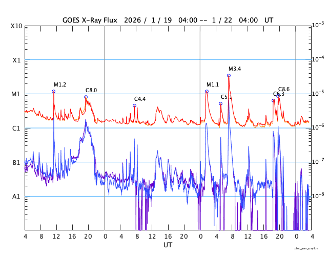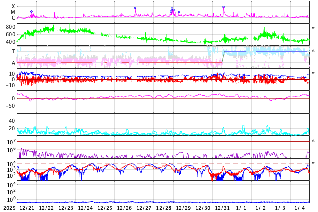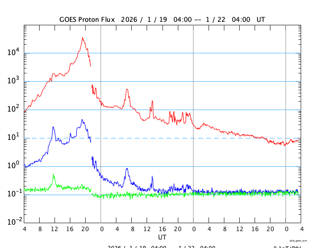 GOES衛星の太陽X線強度。赤・橙 = 0.1〜0.8 nm、青・紫 = 0.05〜0.4 nm (c) データ:NOAA/SWPC、作図:宇宙天気ニュース ![]() GOES衛星による、静止衛星軌道における高エネルギー陽子の変化 (c) データ:NOAA/SWPC、作図:宇宙天気ニュース ![]() | |||||||||||||||||||||||||||||||||||||||||||||||||||||||||||||||||||||||||||||||||||||||||||||||||||||||||||||||||||||||||||||||||||||||||||||||||||||||||||||||||||||||||||||||||||||||||||||||||||||||||||||||||||||||||||||||||||||||||||||||||||||||||||||||||||||||||||||||||||||||||